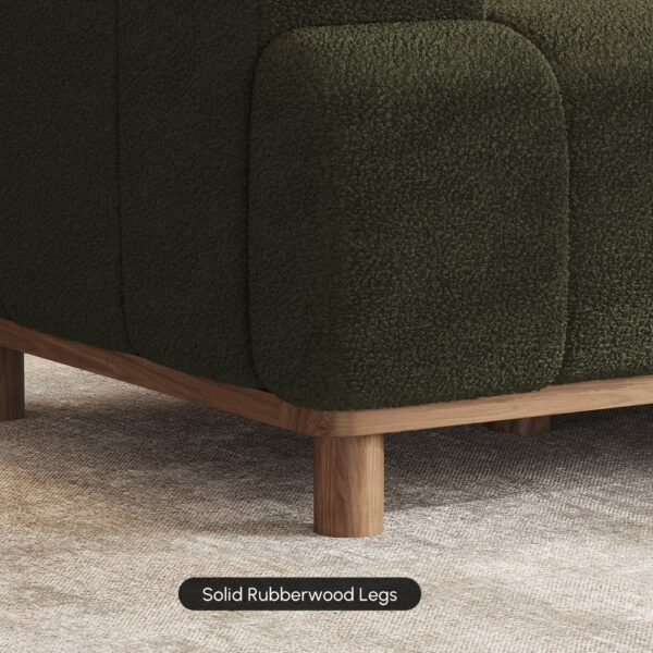 This modular sectional sofa brings cozy elegance to your living space with its plush boucle fabric and solid rubber wood legs. The spacious chaise offers room to stretch out and relax, while the softly curved lines add a touch of modern sophistication to any room.