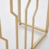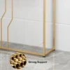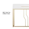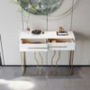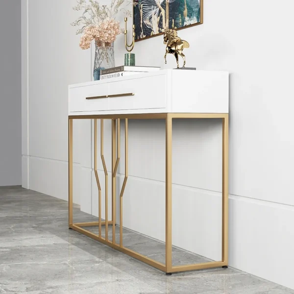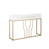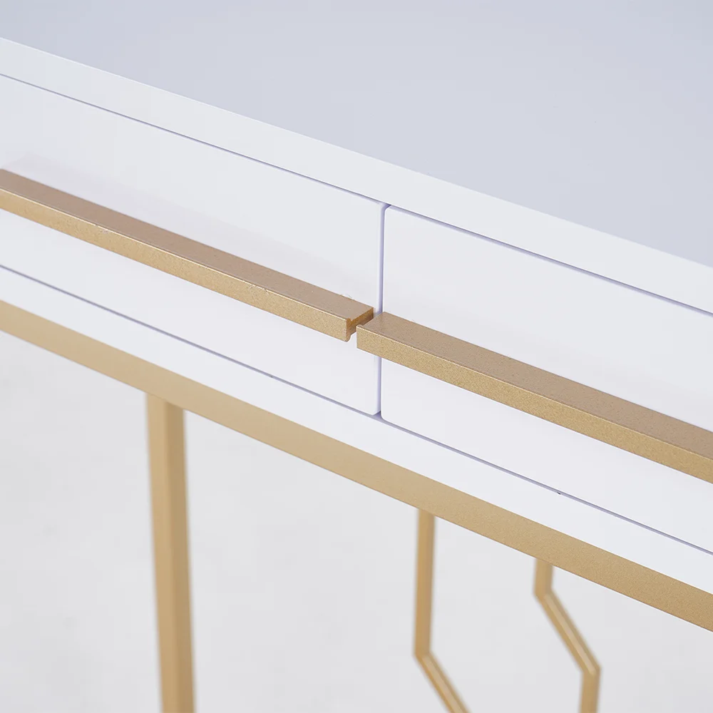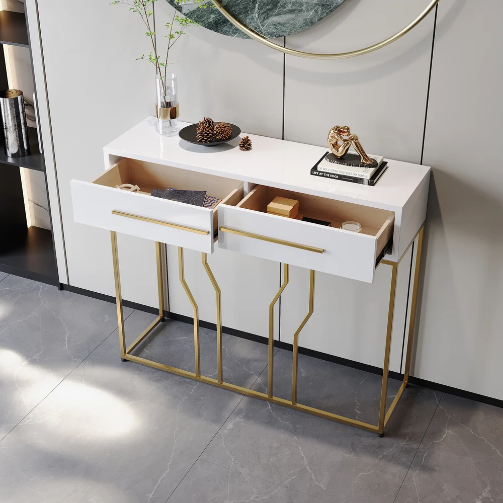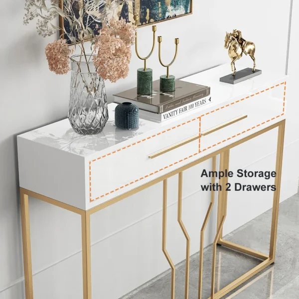 This is a white and gold console table with a sleek wooden top, perfect for photo frames and vases. Two spacious drawers clean up your space, while metal legs add to the overall elegance of the design.