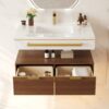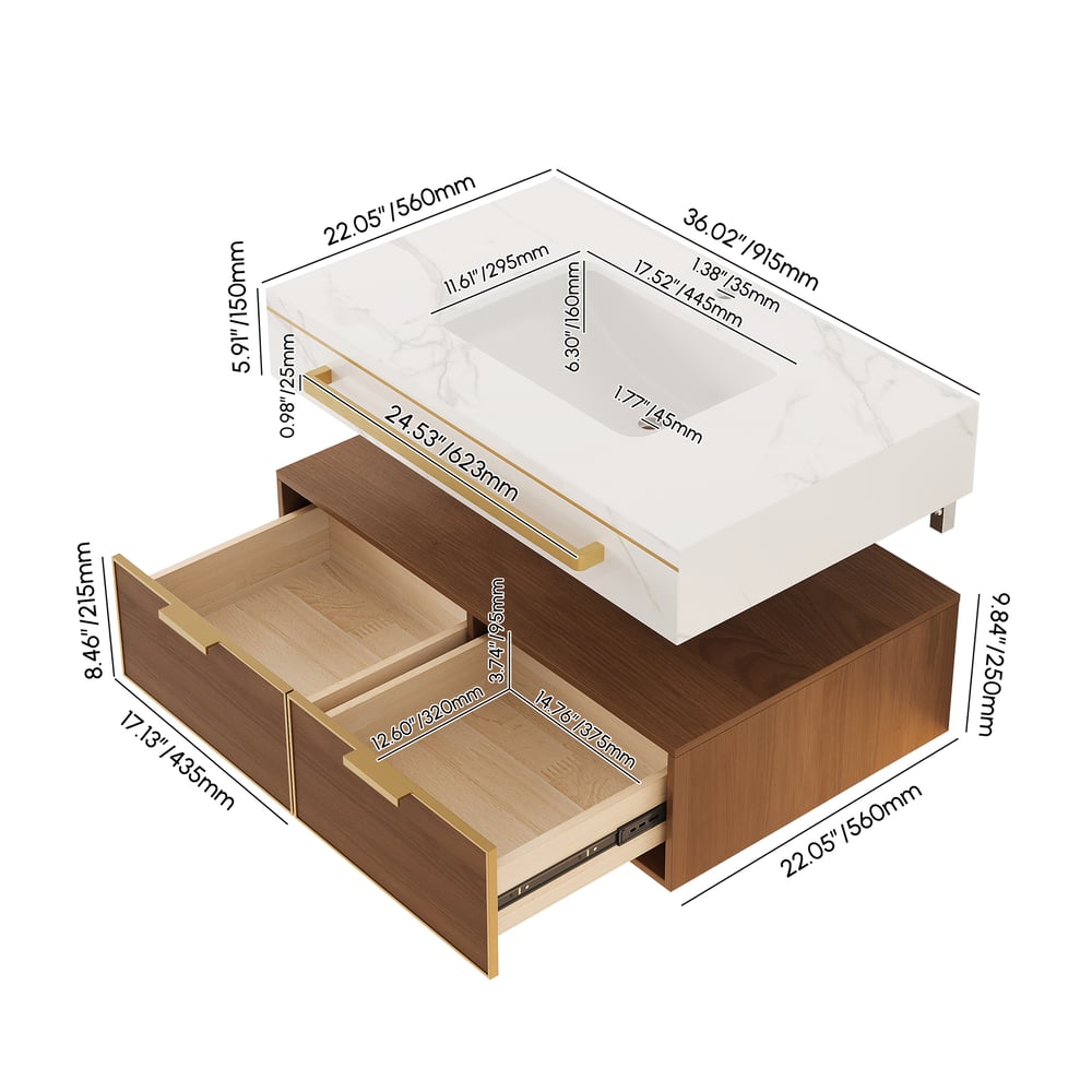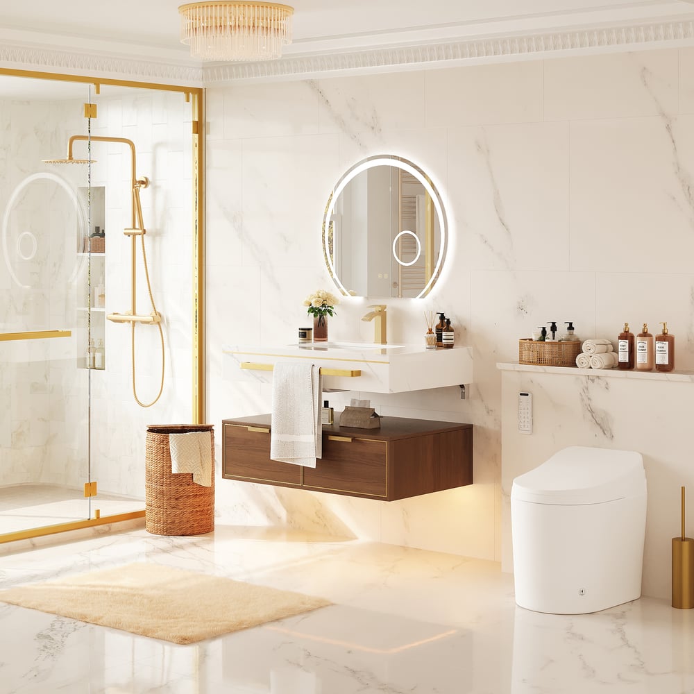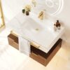 Luxury Design – 36″ floating vanity with walnut finish and brushed gold accents for a sophisticated look.