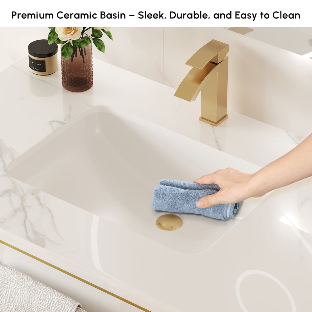 Durable Materials – Waterproof engineered wood cabinet body with sintered stone countertop and high-quality ceramic sink.