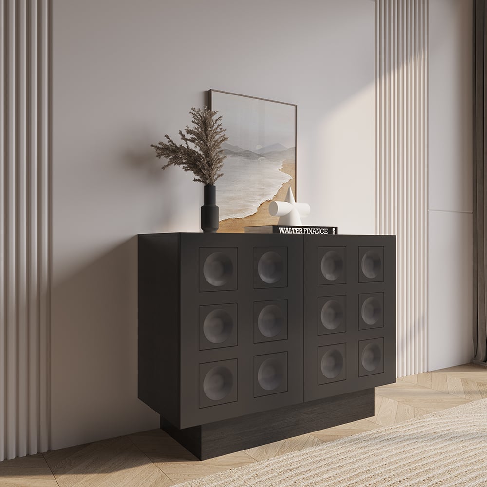 This black sideboard makes quite the statement with modern style in your space. Featuring delicate circle surface detail, this credenza will be the perfect piece for your well-curated aesthetic. Two doors open to reveal shelves and drawers that offer versatile interior storage. Constructed from fine MDF and high-quality glass, this cabinet will give years of service and timeless elegance.