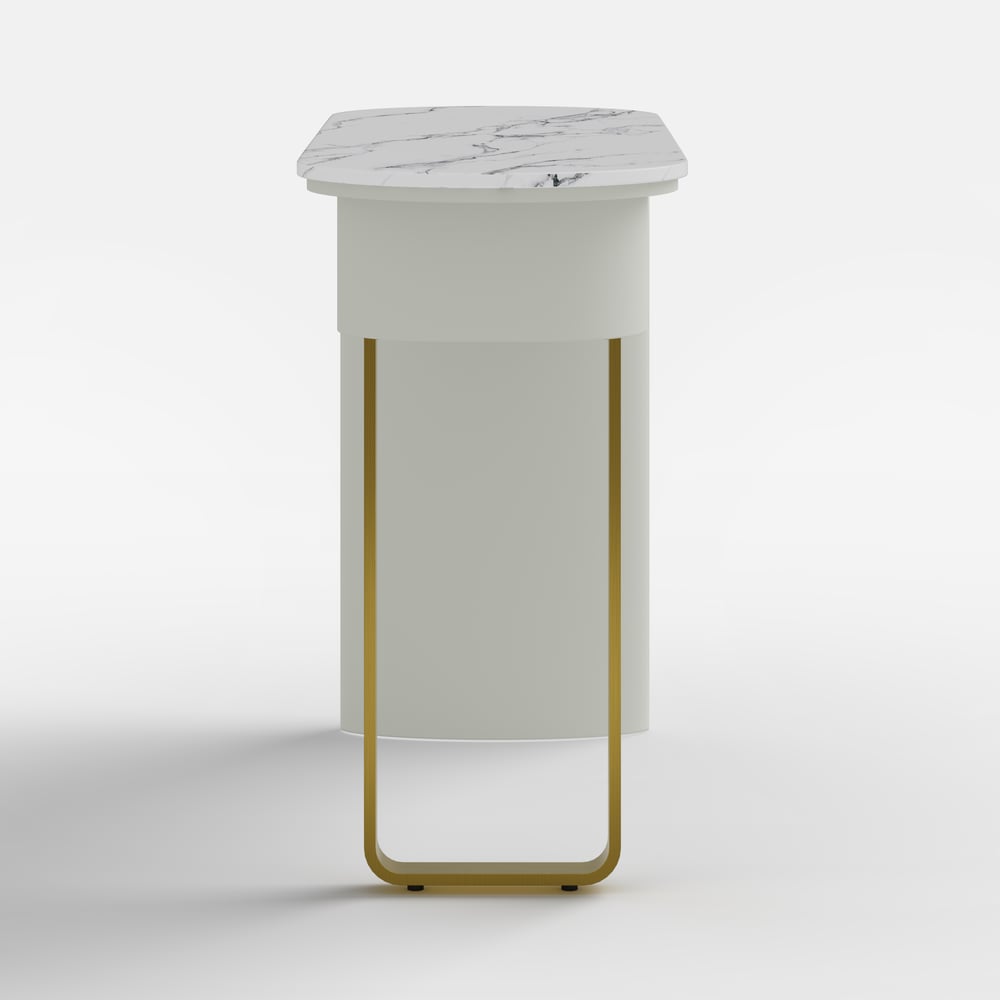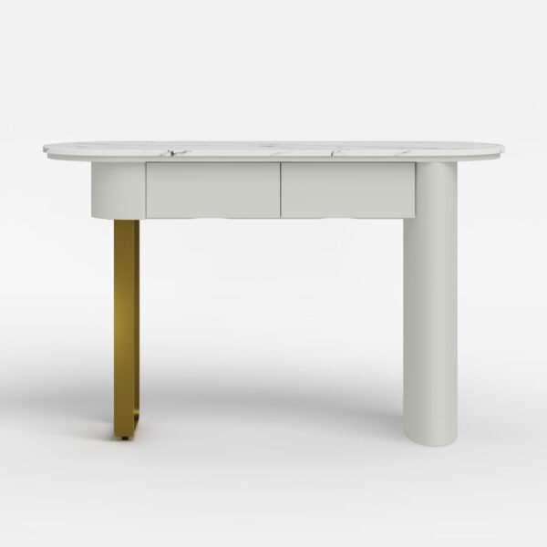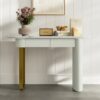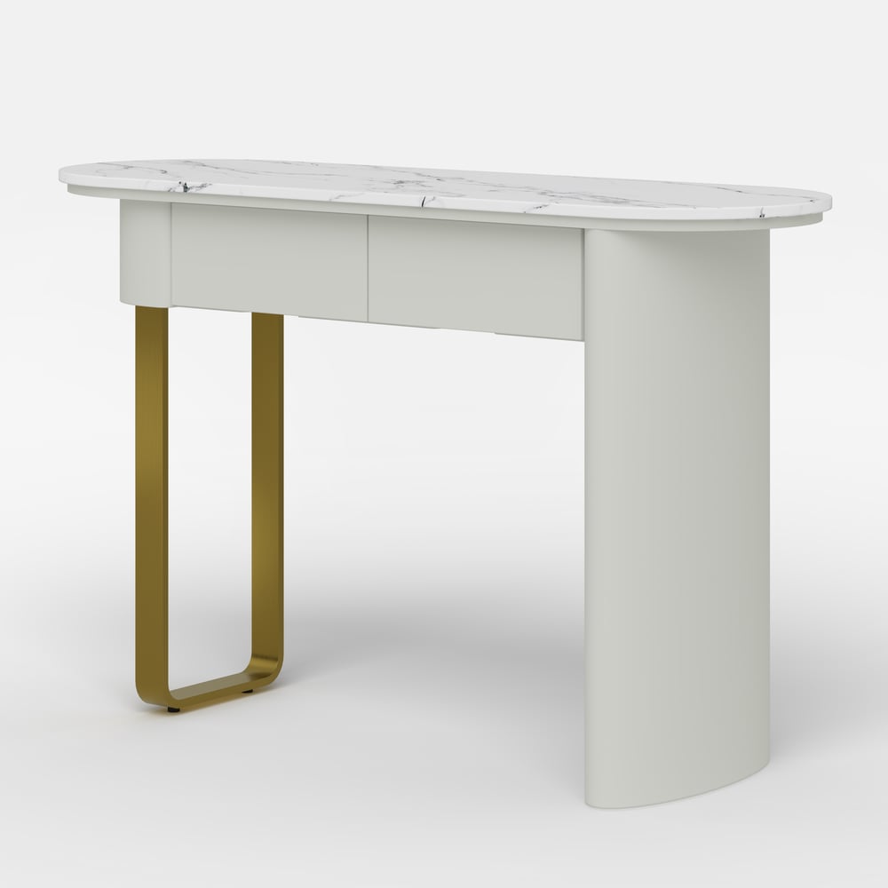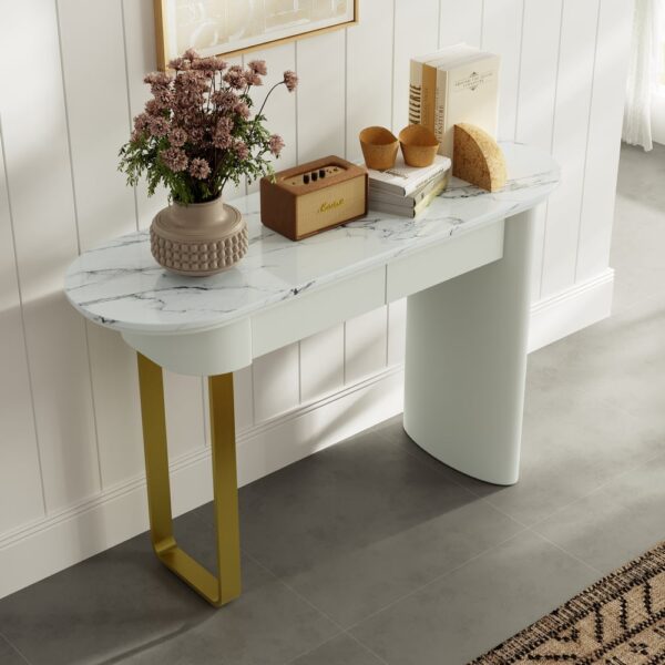 Upgrade your entryway with this modern console table featuring a luxurious marble tabletop and sleek golden metal legs. The table offers a perfect blend of style and function, with two spacious drawers for essential storage. Its sophisticated design enhances any hallway or living space, providing a chic and practical solution for organizing your home.