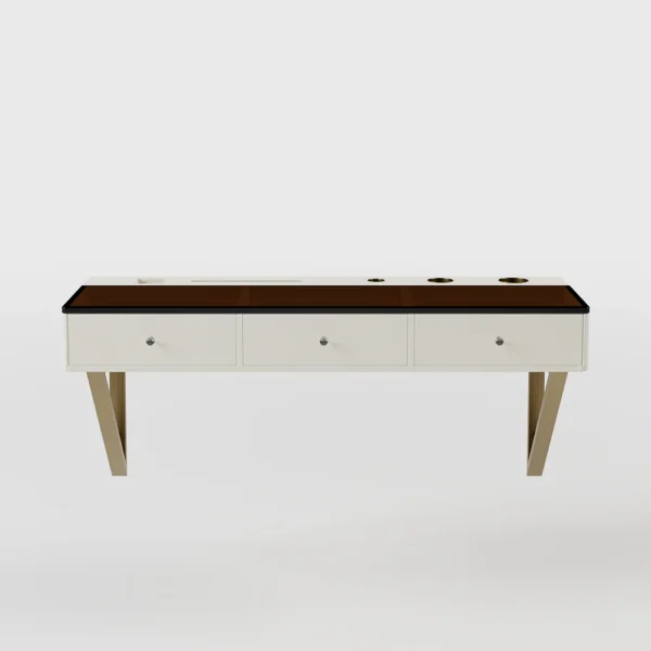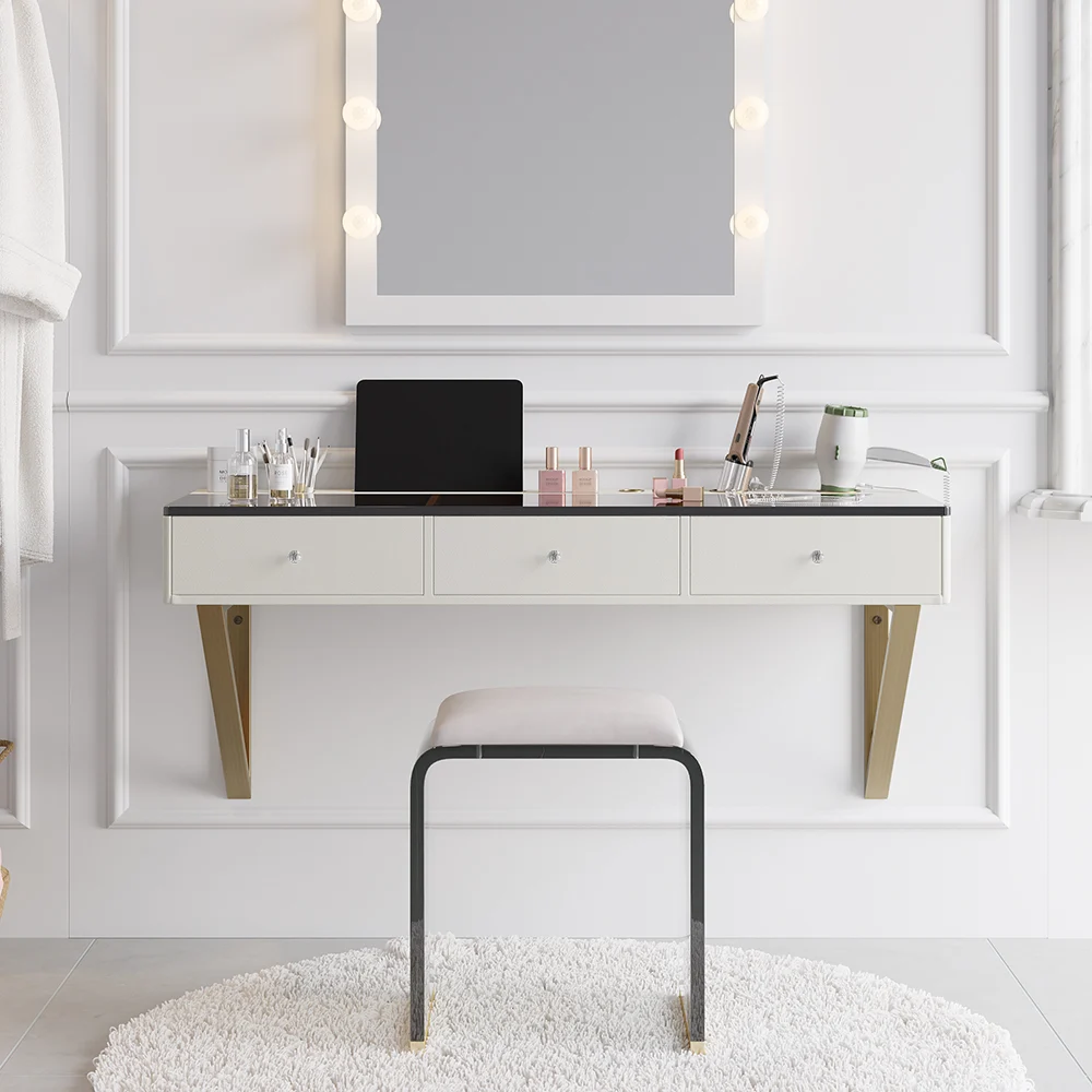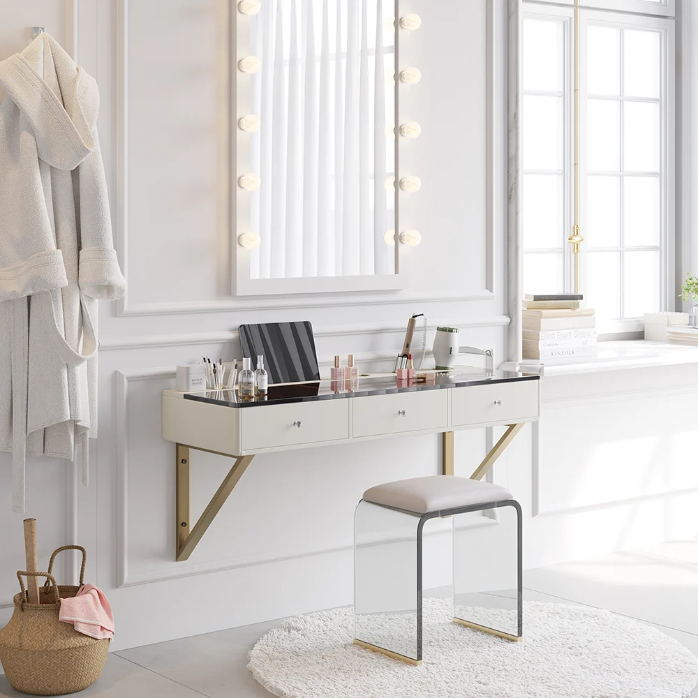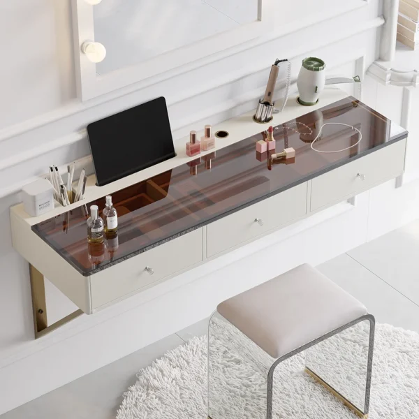 This floating makeup vanity delivers all the features you need to get your daily makeup done. Features with wall-mounted design and amber tempered glass top, different sizes of cutouts to cradle electric hair accessories, let alone ample storage of 3 drawers for your cosmetic products. The top panel can hold a phone or tablet, which is perfect for watching videos while doing makeup.
