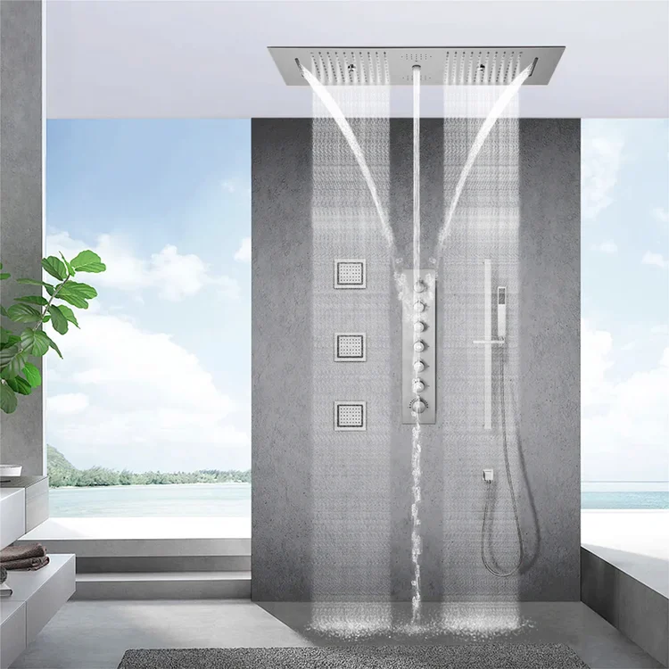 Ultimate relaxation with this 6 Functions Modern Thermostatic Massage Shower System. You’ll get a ceiling mounted waterfall and rainfall shower head, which will feel like you’re standing under the rain. Customize your shower experience with the remote-controlled LED lights and the Bluetooth audio.