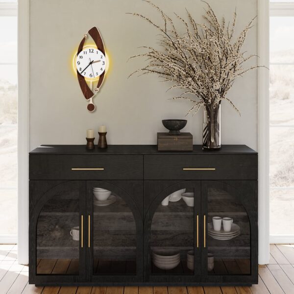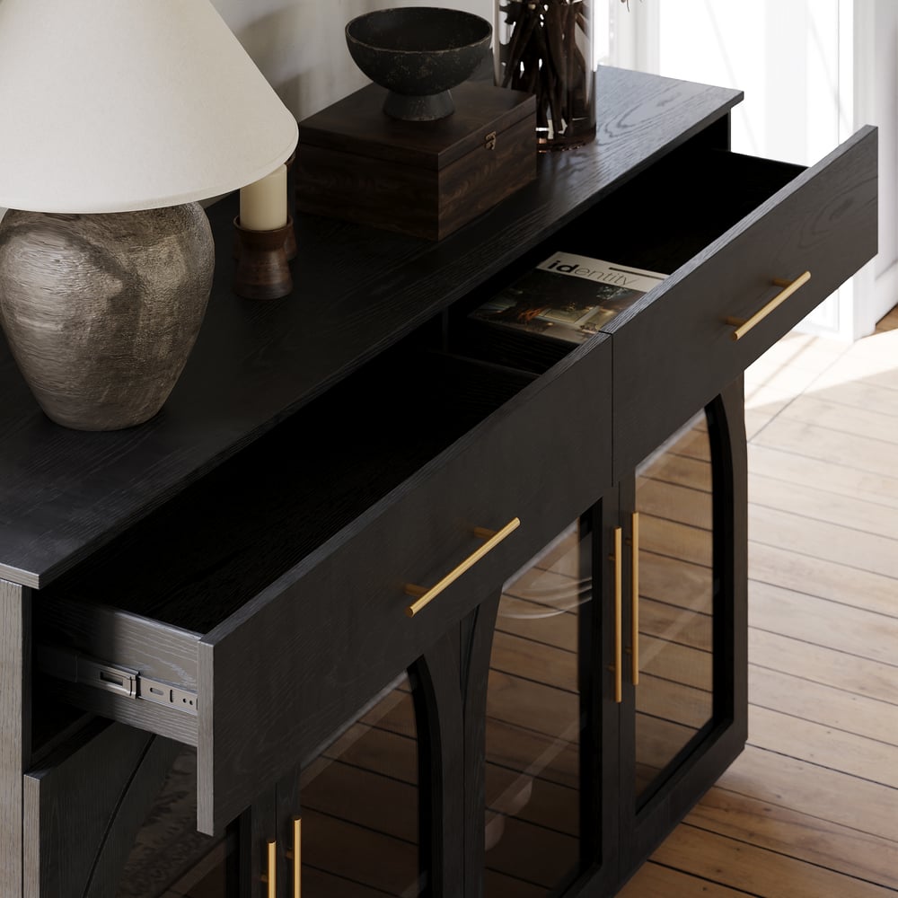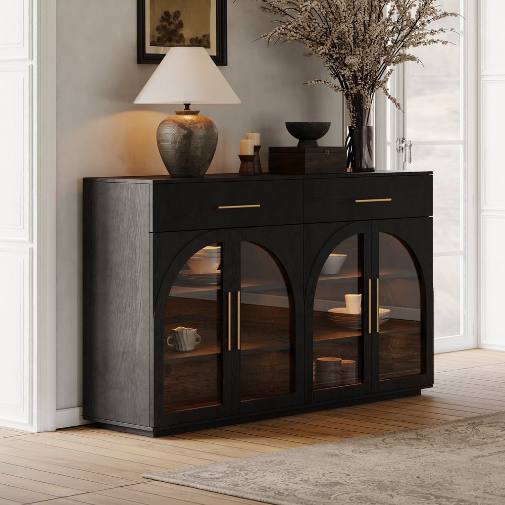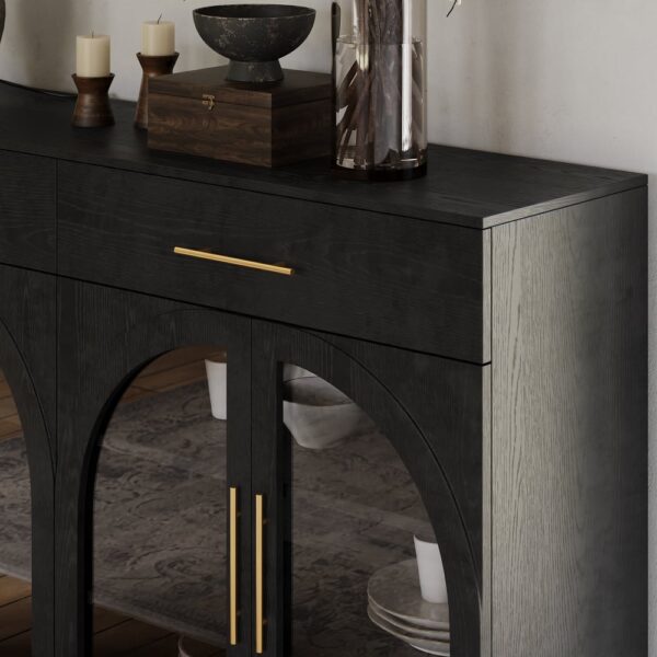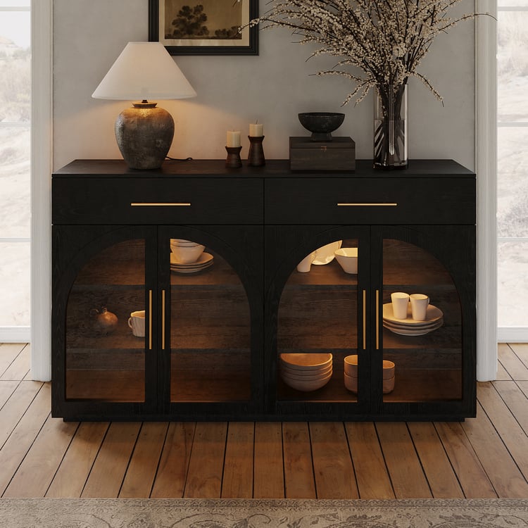 Arched glass doors give a sculptural, airy feel while still protecting and showcasing what’s inside.