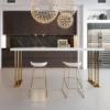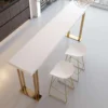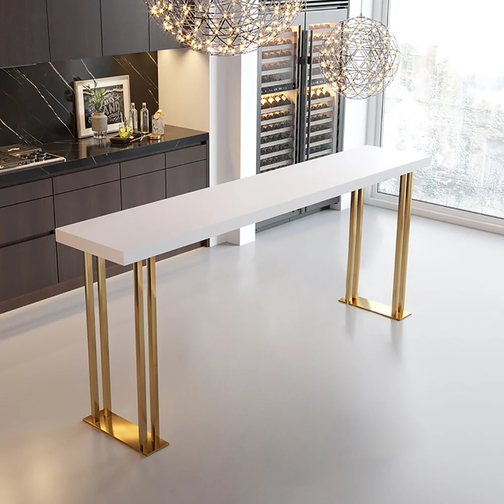 Add a touch of style and class to your house or commercial space with this 63″ modern white bar table. Constructed from long-lasting wood on top and featuring an aesthetically pleasing gold-finished stainless steel sled base, the table combines functionality with style and elegance at counter height. Its minimalist construction along with clean lines allows for multifaceted uses-from dining areas, home bars, and restaurants to serving or hosting any gathering with sophistication, or enjoying quiet time alone with family.
