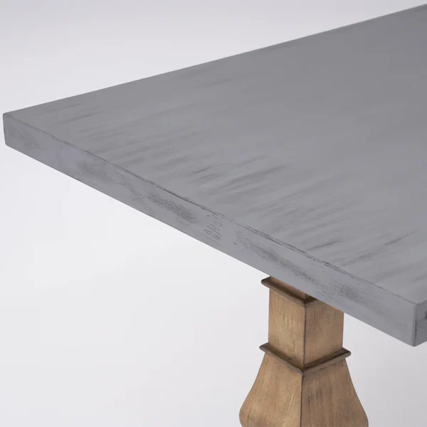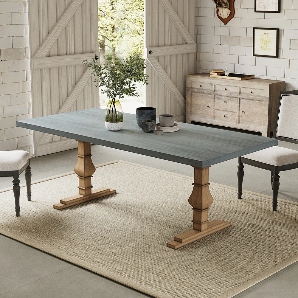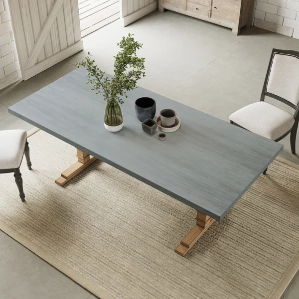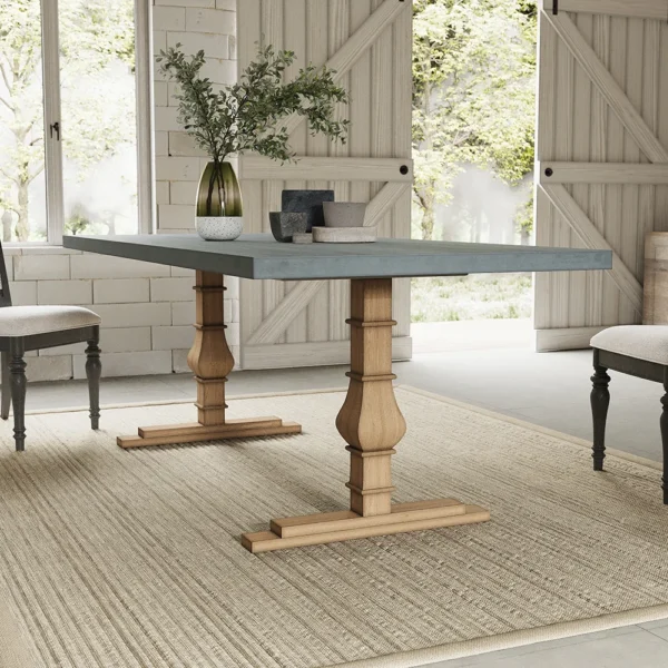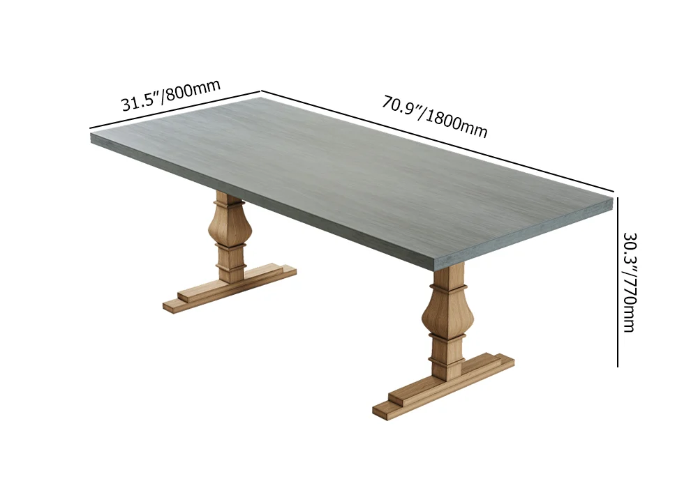Give your dining room a sleek touch by adding this stylish, rustic concrete gray dining table, accommodating 8 guests with ease. The 70.9″, faux marble rectangular tabletop comes in a very sleek yet rugged presentation. Constructed from solid wood, the robust double pedestal base gives this table stability to match its style. The concrete gray finish adds a touch of modern farmhouse and rustic charm that will be the crowning glory of any gathering.