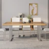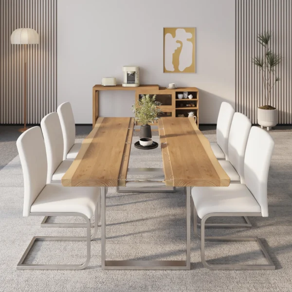 This 70.9″ rectangular dining table combines natural wood and transparent acrylic for a unique contemporary look. Featuring live-edge wood detailing on the tabletop and a sturdy metal sled base, it comfortably seats 8 – perfect for daily meals or entertaining guests while bringing natural vibes to your dining space.