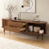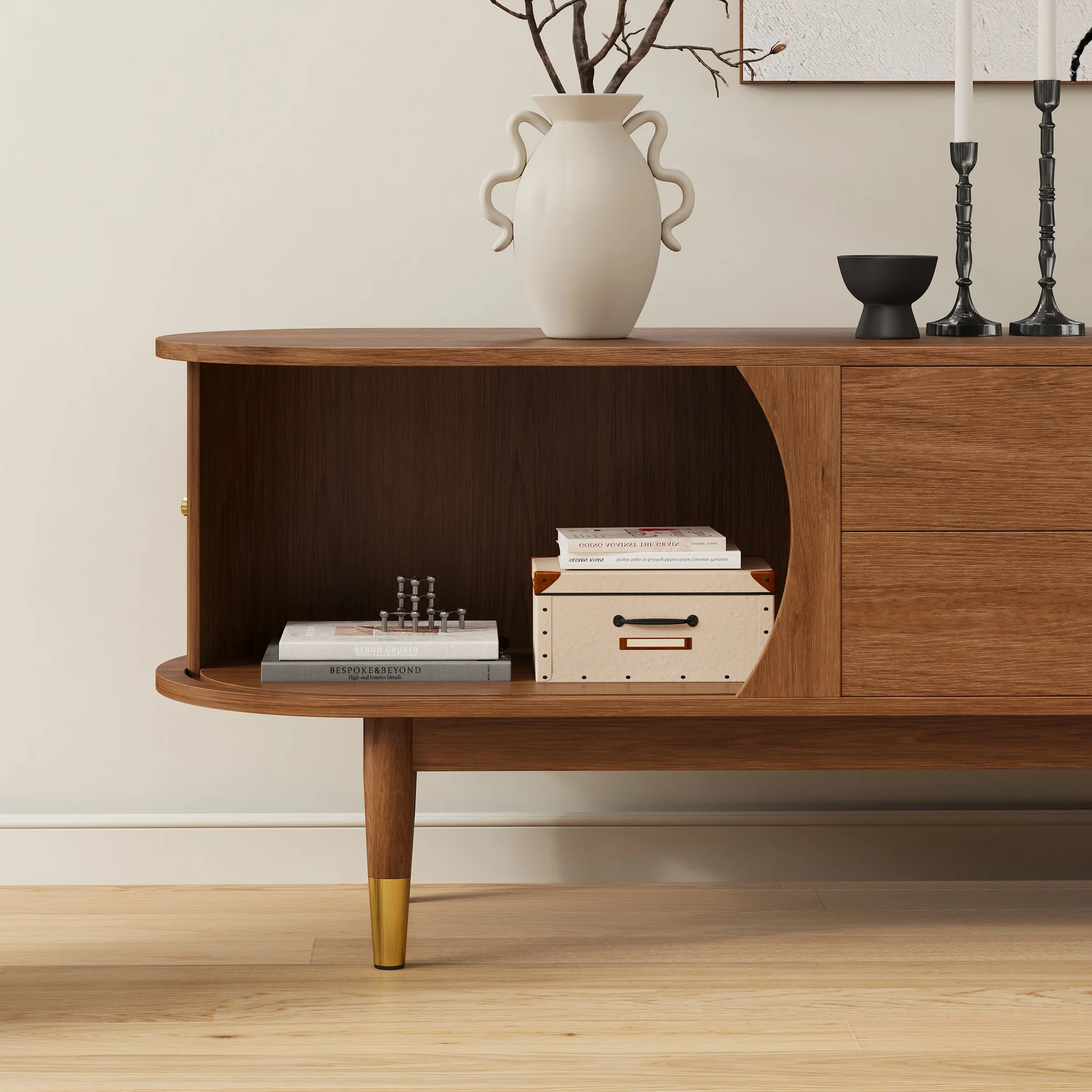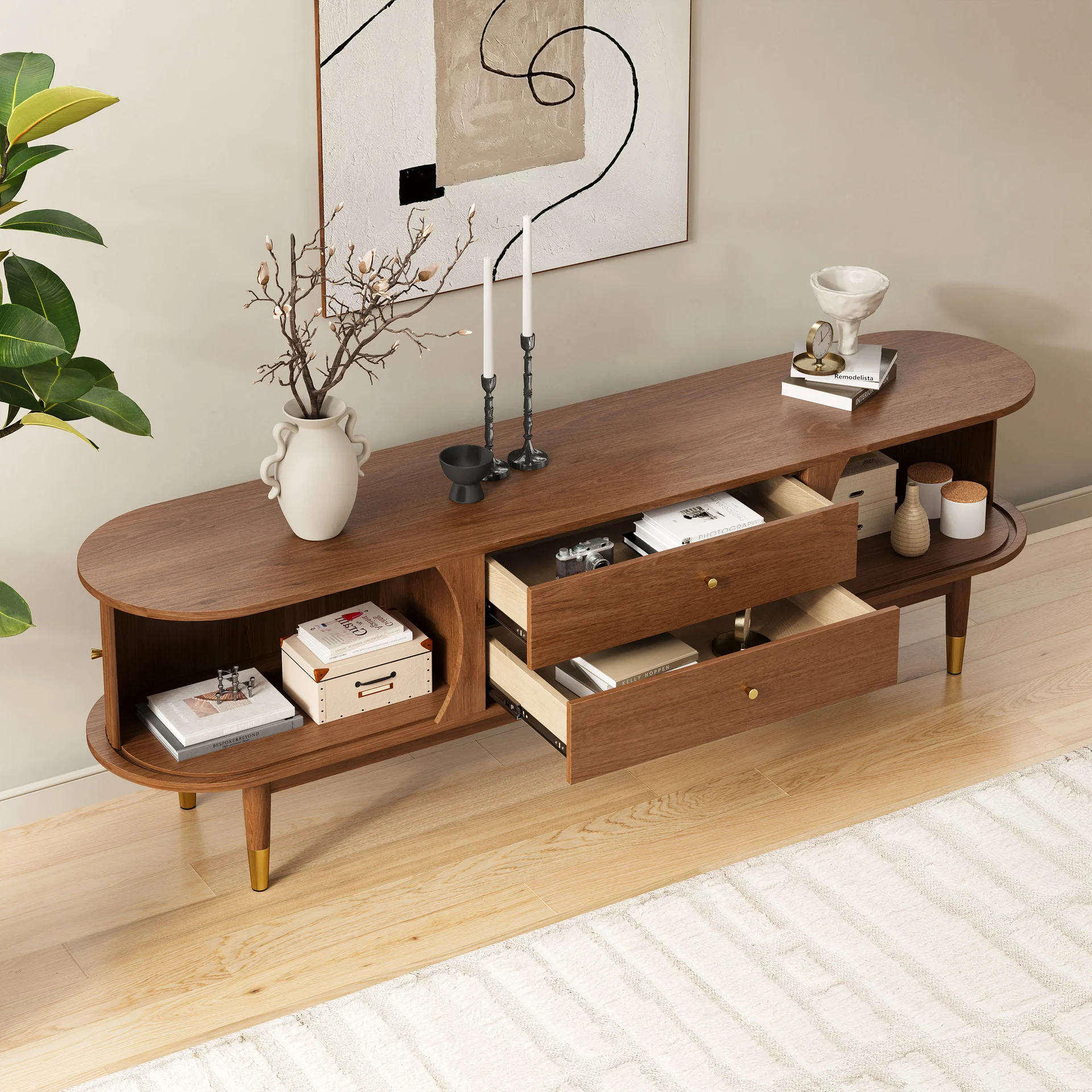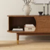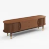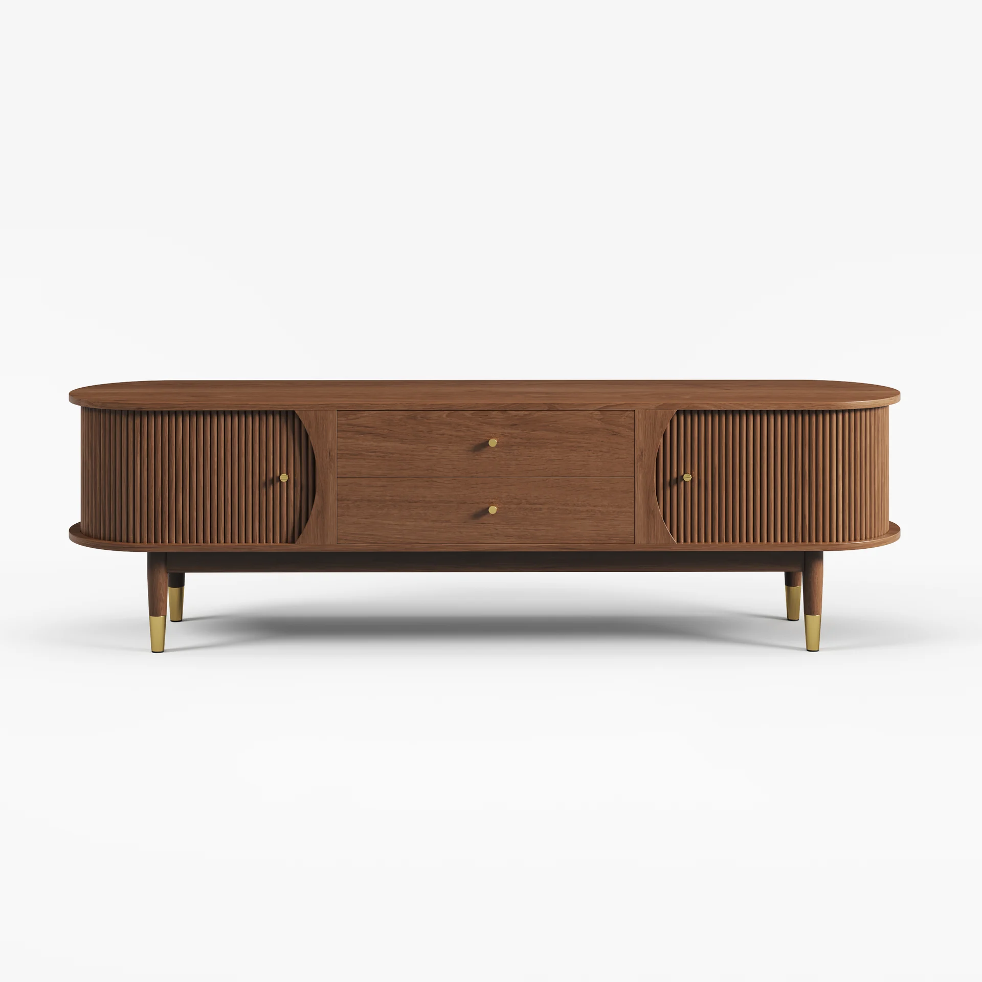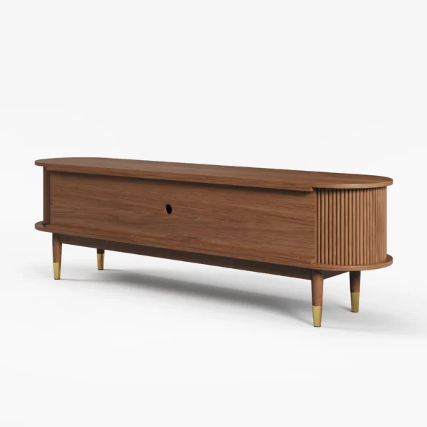 Transform your viewing experience with this functional art piece, offering sleek walnut tones and innovative roll-up doors for discreet storage. The mid-century inspired design brings warmth and character to your space while keeping everything neatly accessible yet out of sight.