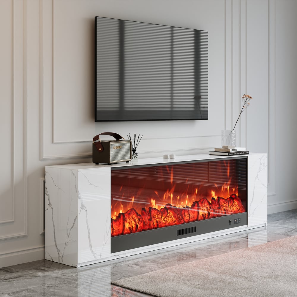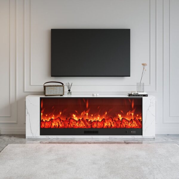 This electric fireplace TV stand is elegant and energy-saving. Features 5 types of flame brightness, realistic 3D flame effects, glowing logs, and embers, which can heat the area to 400 square feet, the temperature can be adjusted. No firewood, no dust, no smoke, and no clean up, creating a clean and cozy relaxing space for you.