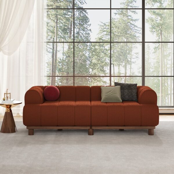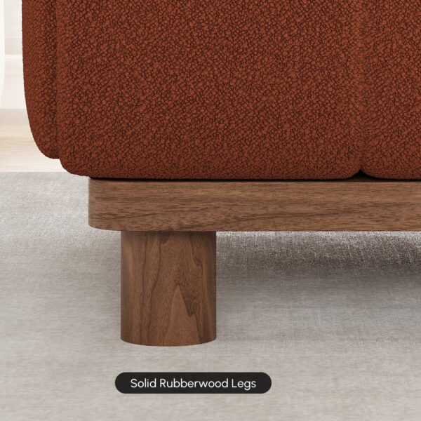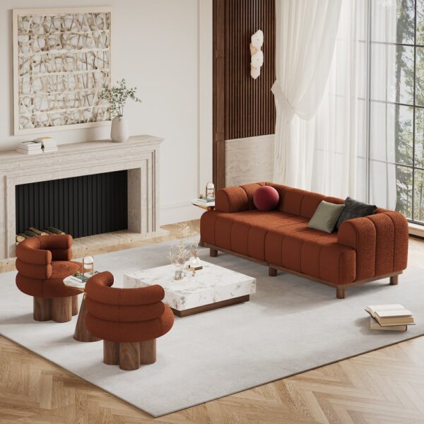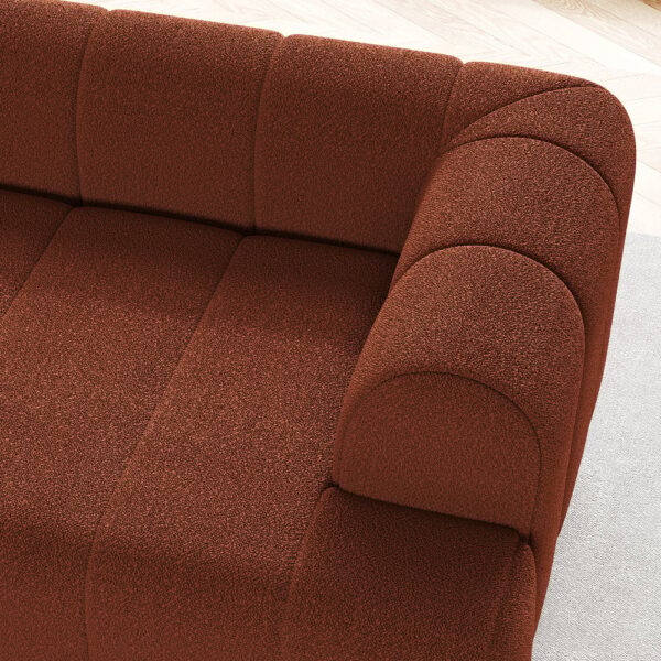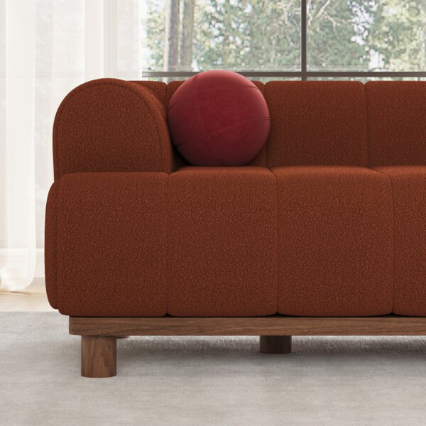 This modern sofa combines plush comfort with timeless elegance, featuring a cozy boucle fabric and a sturdy rubberwood frame. Its rounded arms and block feet add a sculptural touch, making it a stylish and inviting centerpiece for any living room.