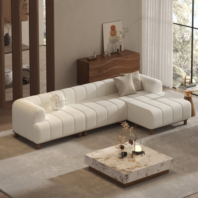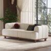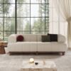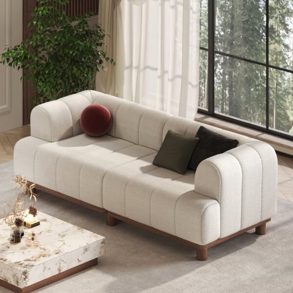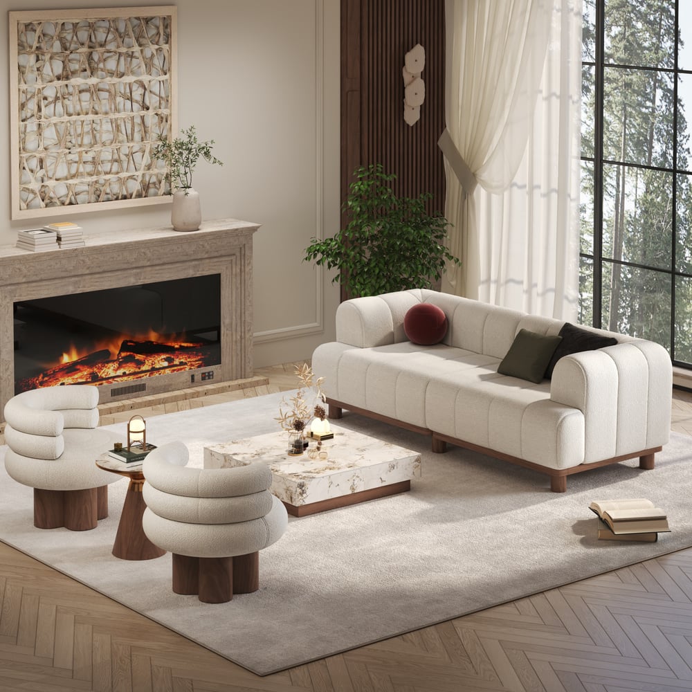 This modern sofa combines plush comfort with timeless elegance, featuring a cozy boucle fabric and a sturdy rubberwood frame. Its rounded arms and block feet add a sculptural touch, making it a stylish and inviting centerpiece for any living room.