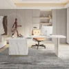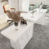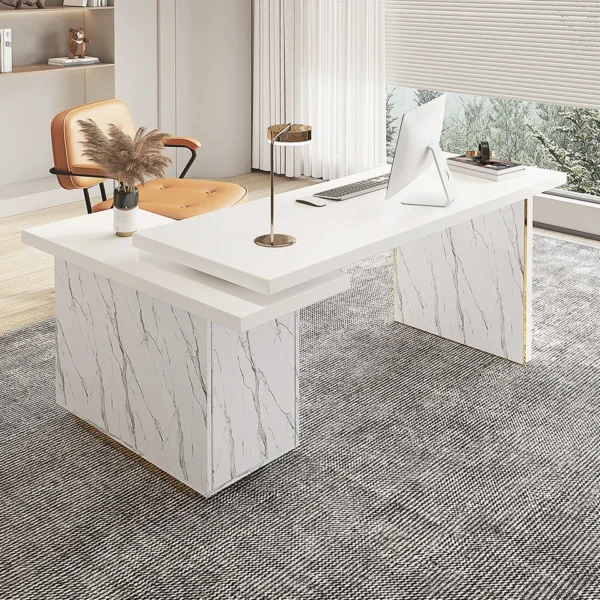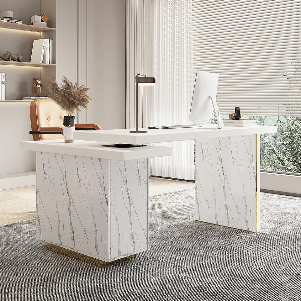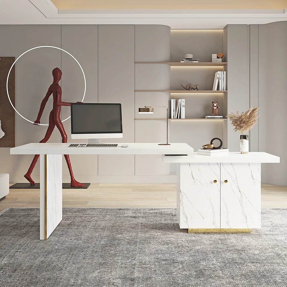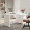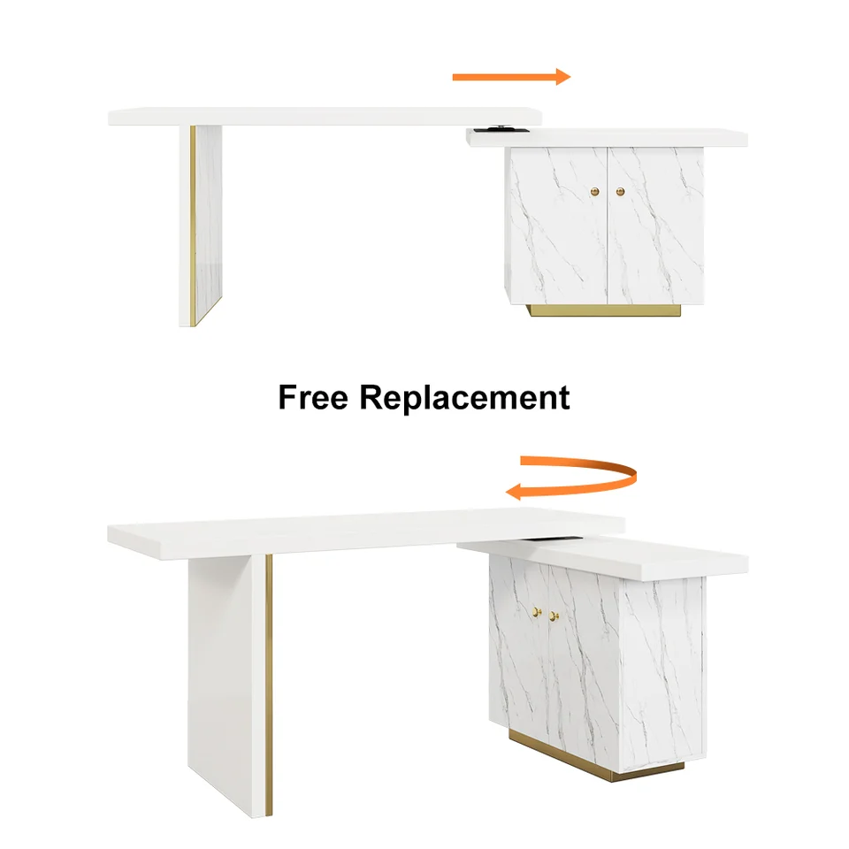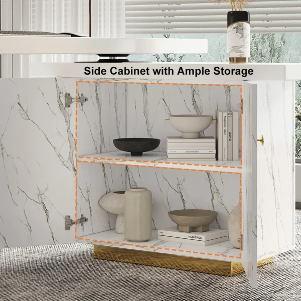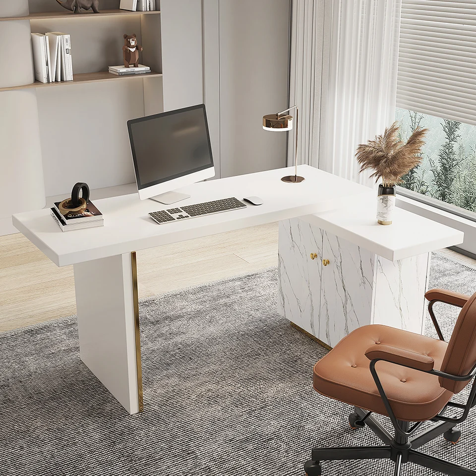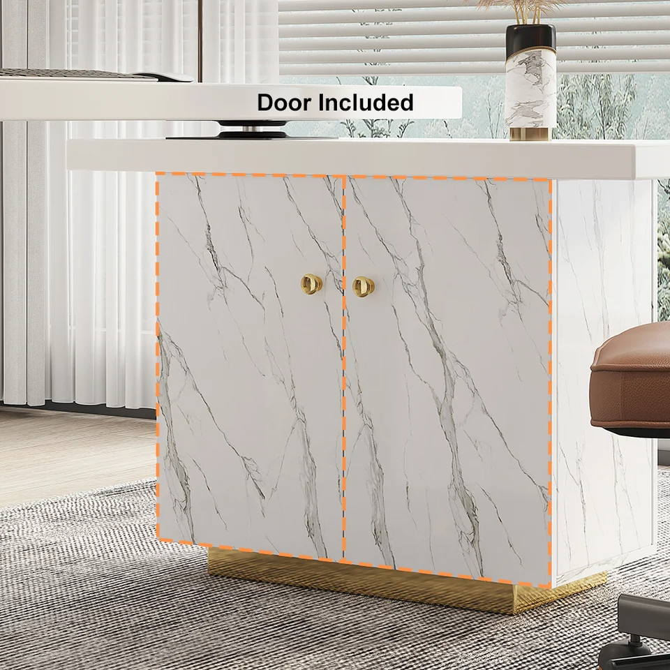 88″ Modern White L-Shape Writing Desk with Side Cabinet Wood Office Desk Gold Finish