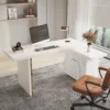 Update your home office or office in style with the help of this modern L-shaped wiritng desk. Made from engineered wood and stainless steel, this desk has an l-shaped design that’s perfect for any corner or spacious office. The side cabinet includes a two-door cabinet, so there’s plenty of space to tuck away loose odds and ends. A white finish allows this desk to blend with a variety of color schemes. Whether you run your business from home or just need a spot to write, this desk is an ideal anchor for your workspace that complements nearly multi-occasion.