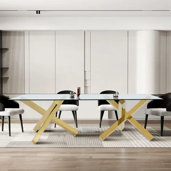 This is the bold statement dining table in every dining room, boasting a sleek, durable, and tempered glass top supported by a double pedestal stainless steel base in a luxurious gold finish. It combines the beauty of elegance and functionality. The base tone in contemporary concrete gray greatly merges with the clear glass top, making it all refined yet striking. Perfect for bigger gatherings, this table offers enough space to seat 8-10 people comfortably while adding an air of sophistication to your home.