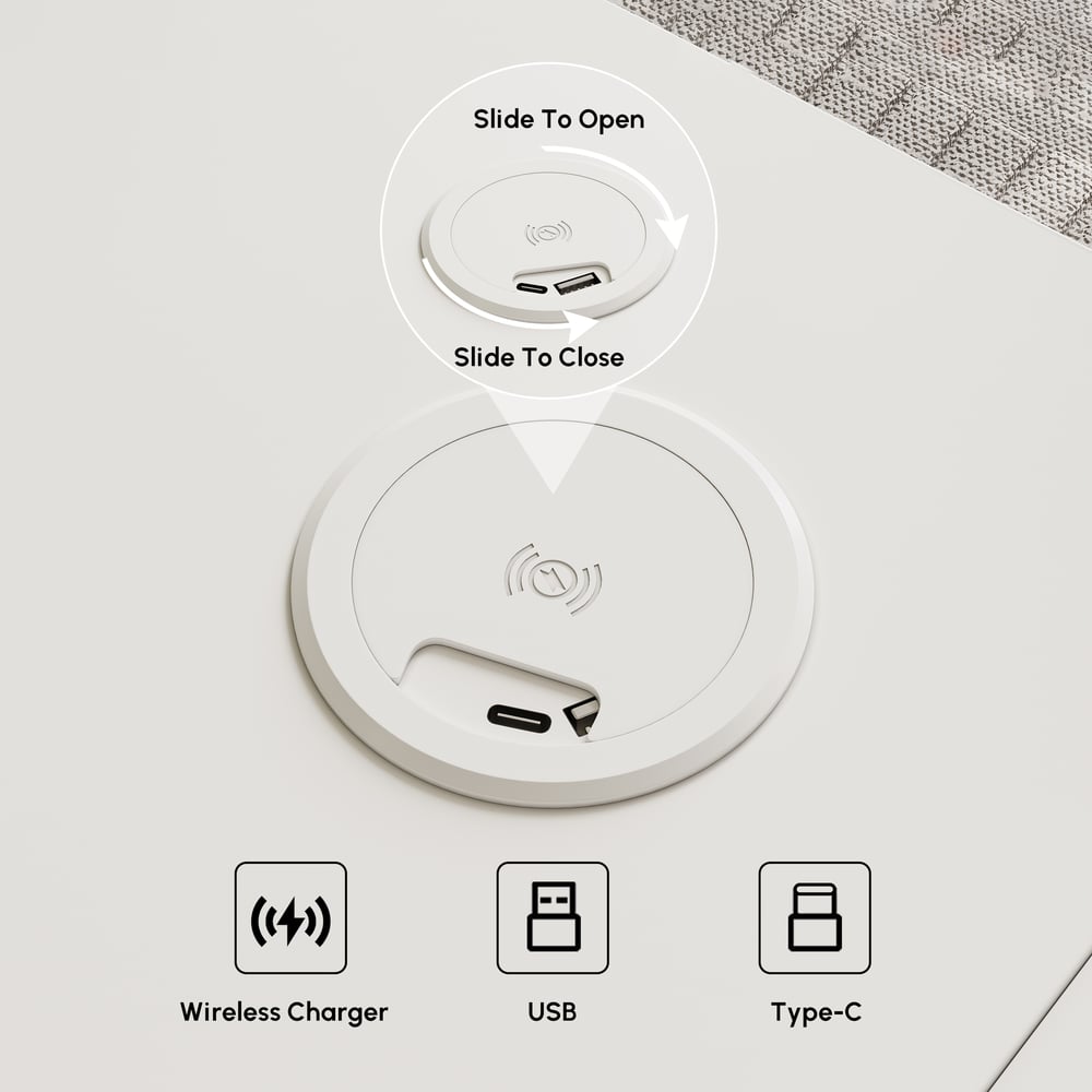 Built-In Wireless Charging And Power Ports: Equipped with wireless charging, USB, and Type-C ports to keep your devices powered up without extra cords or adapters on your desk.