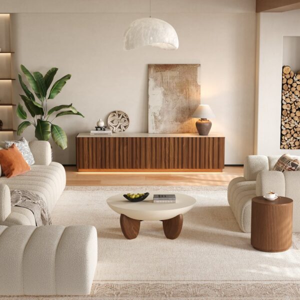 Designed for modern and timeless interiors, the Aura TV Stand brings mid-century warmth to your living room with ash wood fluted details and a travertine stone veneer over sintered stone, creating a calm, organized, and inviting space for everyday living.