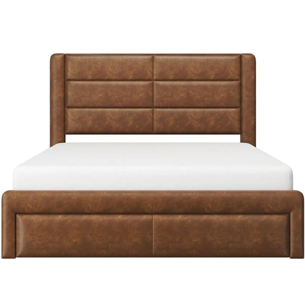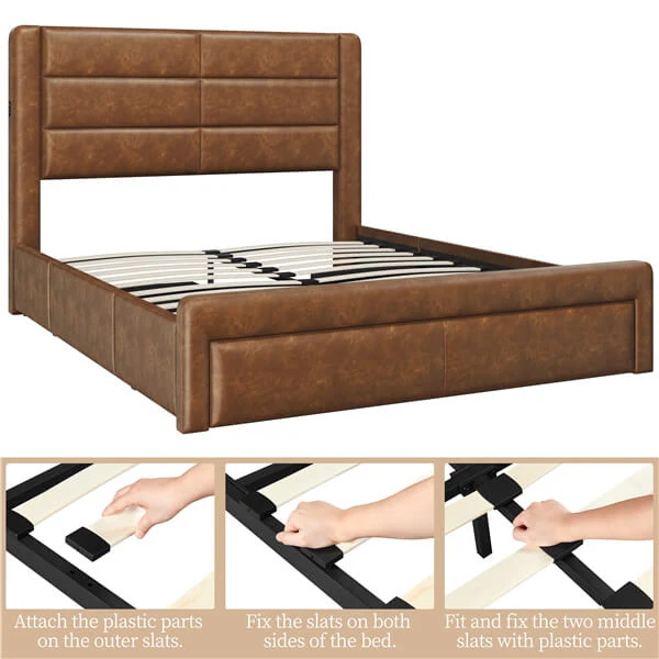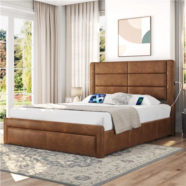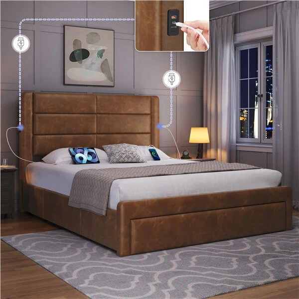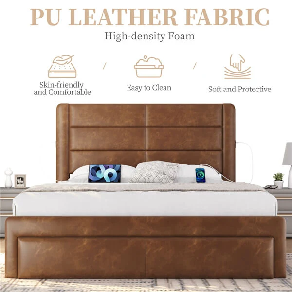 Queen Size Upholstered Bed Frame with Three Storage Drawers / Two Charging Outlets & Two USB Ports / Leather Upholstered Headboard / Mattress Foundation / Wood Slat Support / No Box Spring Needed Amber Brown