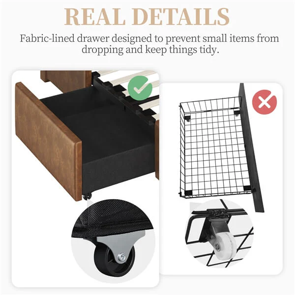 • Three Drawers, Ample Storage Space: Designed with a drawer measuring 32.7″ L × 19.5″ W × 6″ H on each side, and a large drawer measuring 44.5″ L × 19.5″ W × 6″ H at the bed end, providing ideal storage space for bed sheets, clothing and more, for a tidy and clutter-free bedroom. In addition, the three drawers are easily detachable.