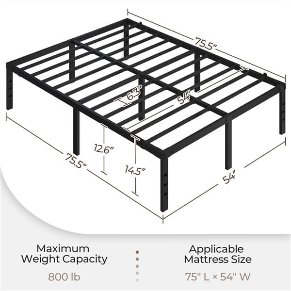• Durable Frame: This full size bed frame is constructed entirely from sturdy steel frame. It includes solid slats and 9 robust metal legs, with a maximum weight capacity of 800 lb. This ensures ample firmness and stability for your daily restful sleep.