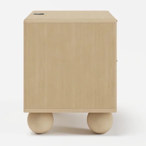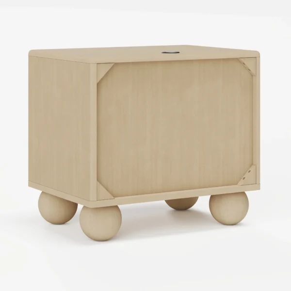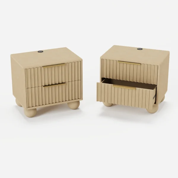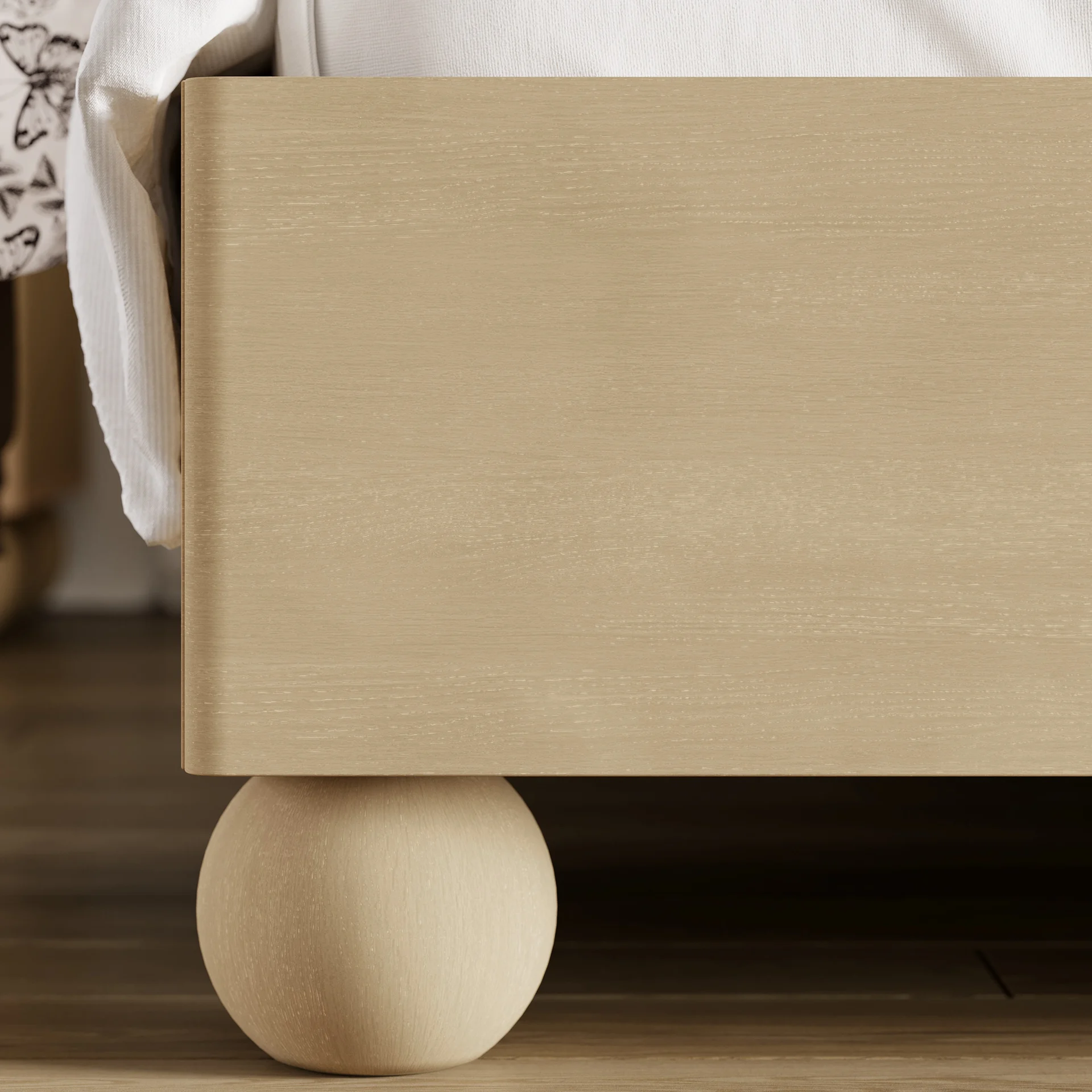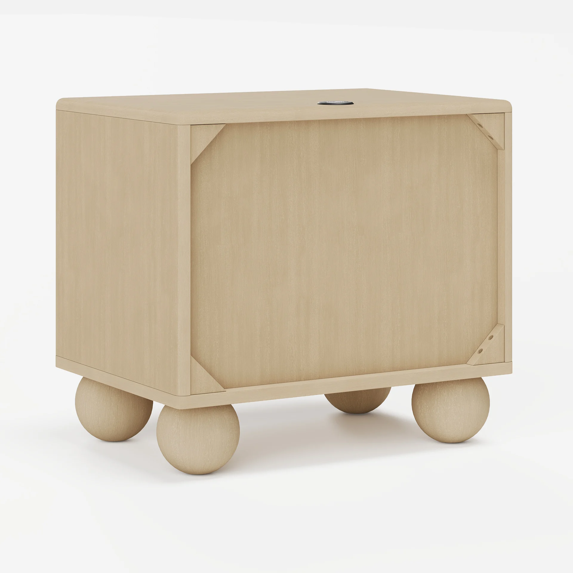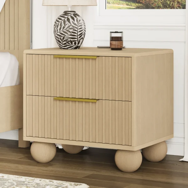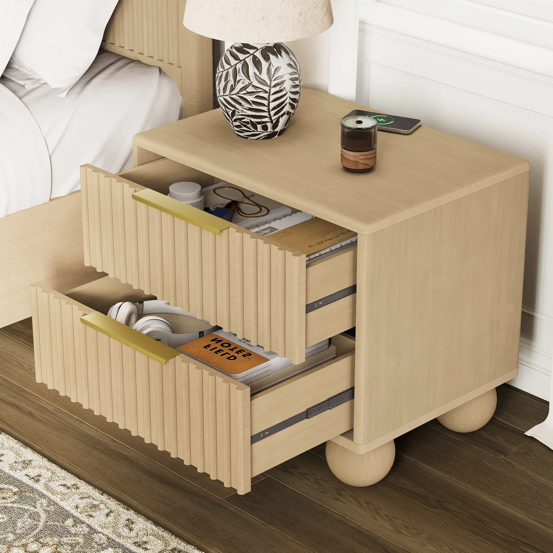 Bring sculptural elegance into your bedroom with this bedroom set, crafted from solid rubberwood for strength and durability. The fluted headboard introduces architectural texture and refined detail, while the bold spherical legs add a playful yet grounded silhouette. Its light natural finish softens the look, blending seamlessly with modern or transitional interiors. The nightstand comes with a built-in charging station on the top, keeping your devices powered up and your nightstand clutter-free. Two spacious drawers offer easy storage for bedside essentials, making it as practical as it is stylish.