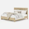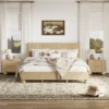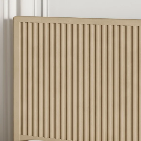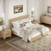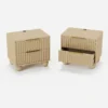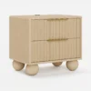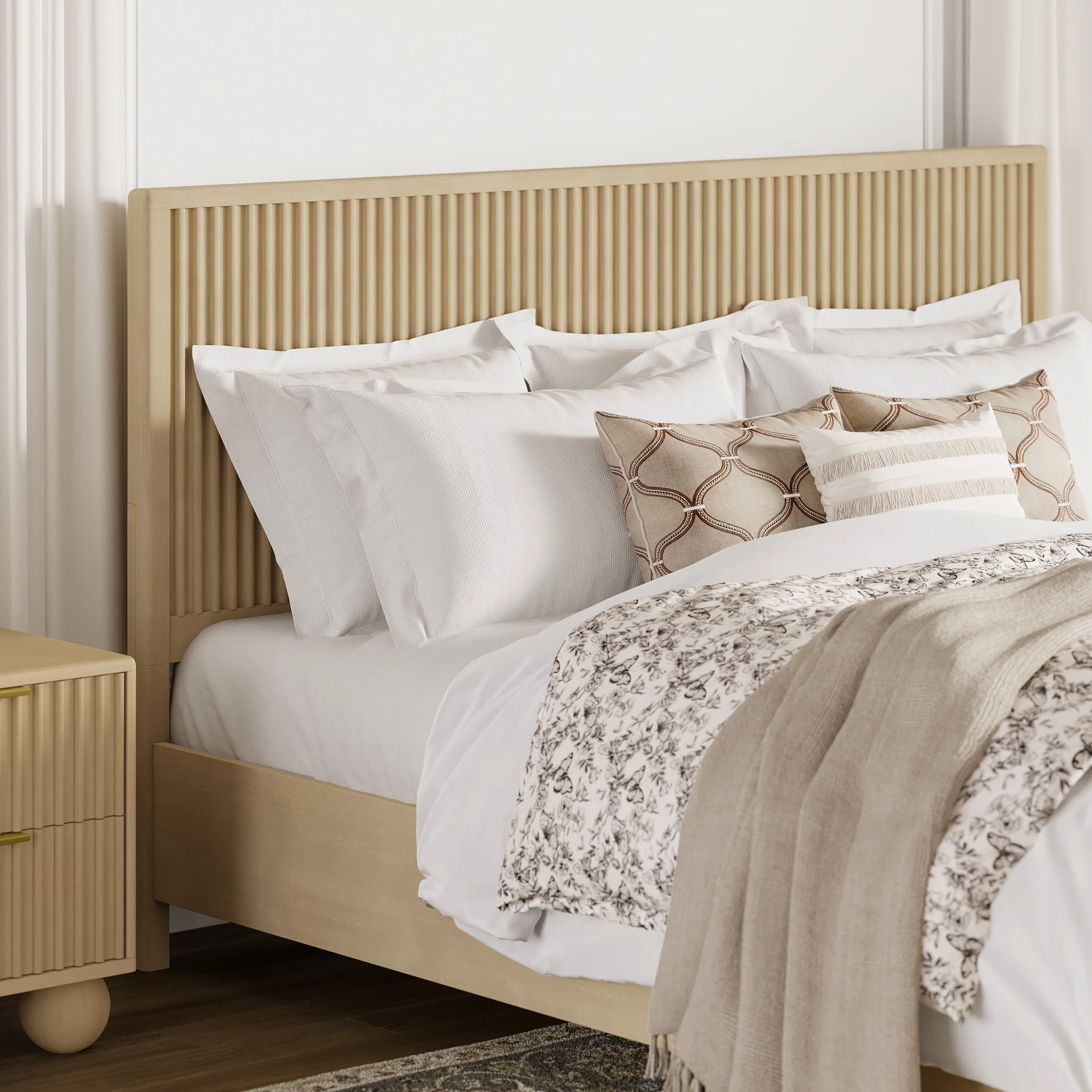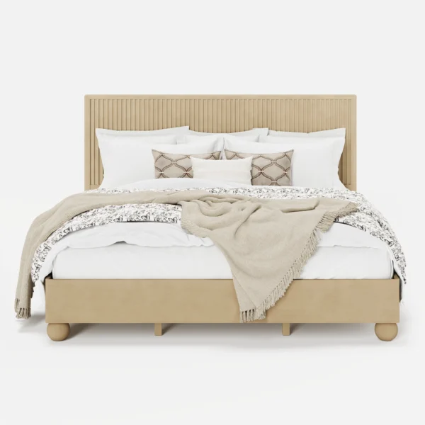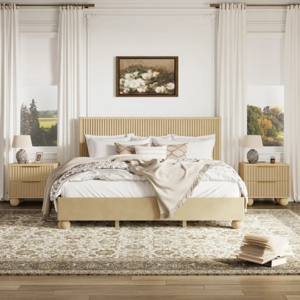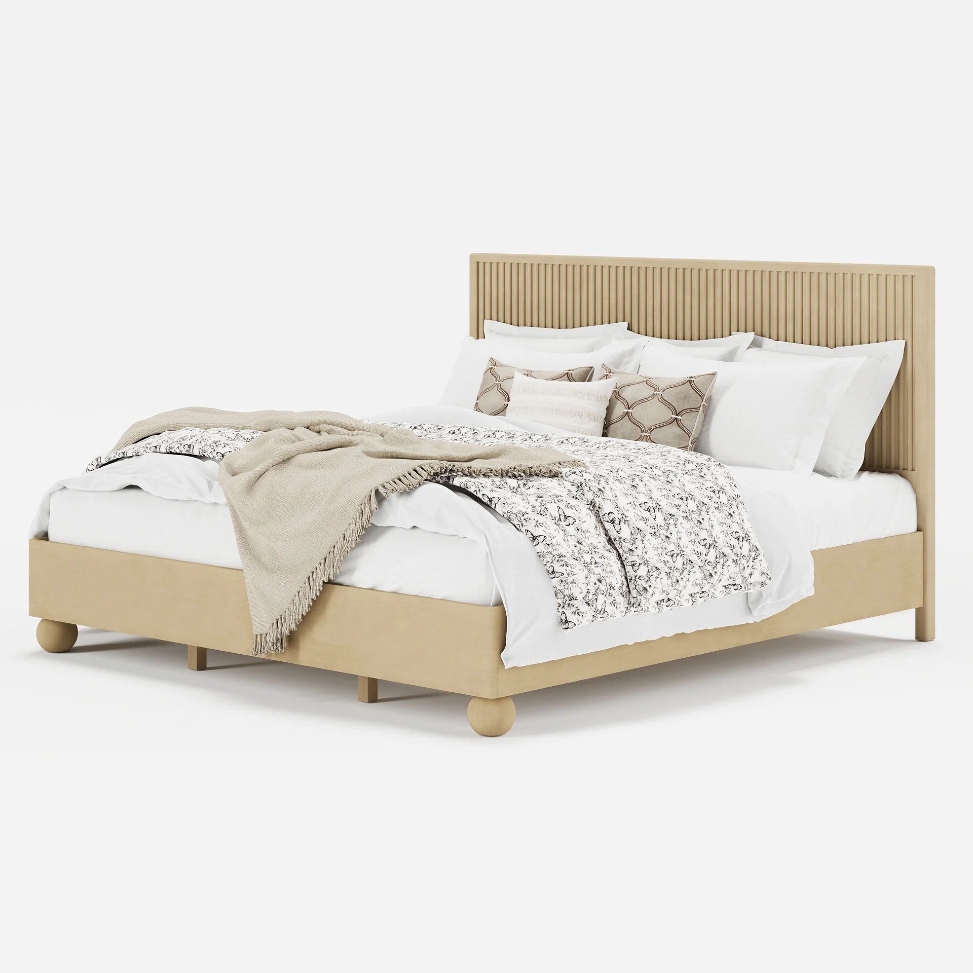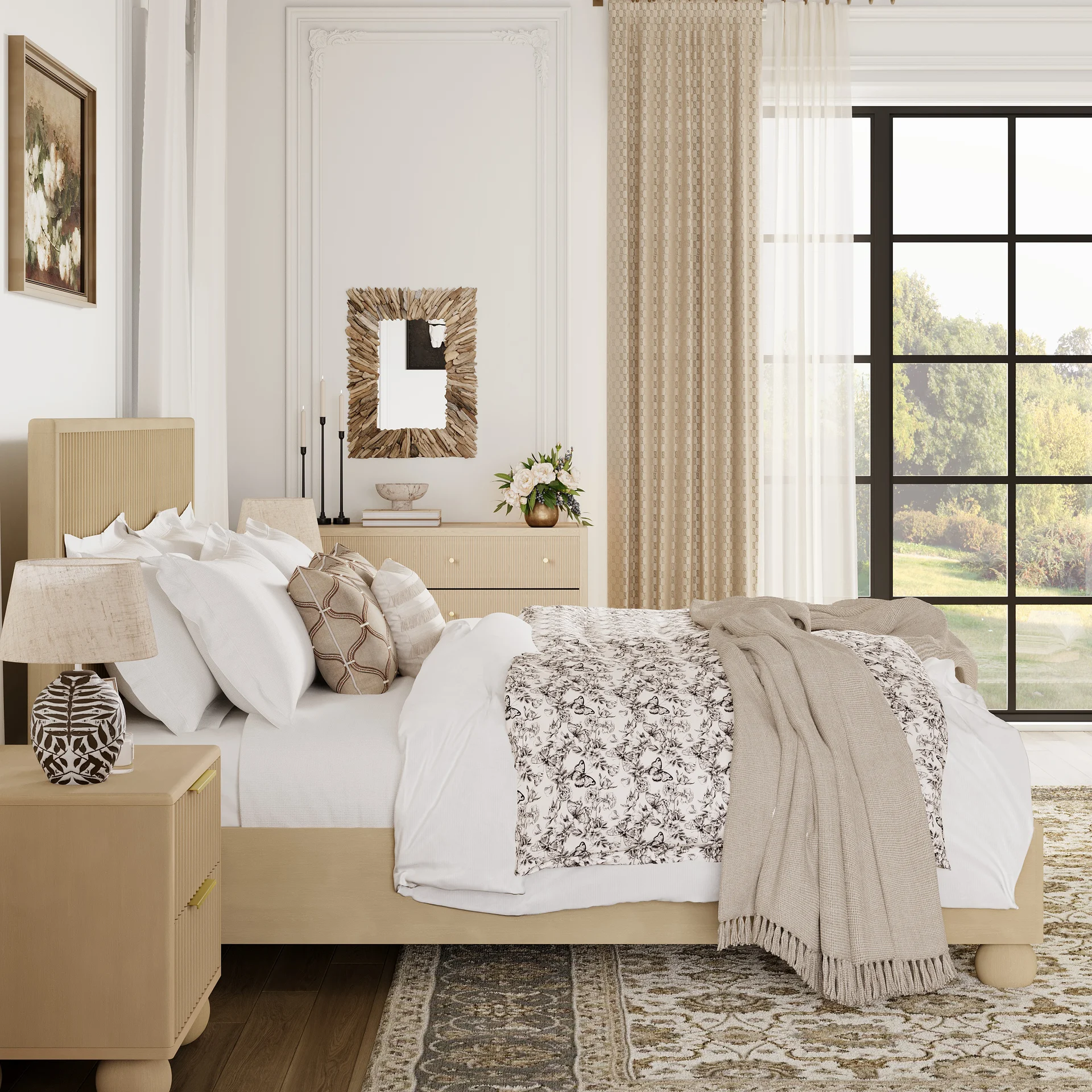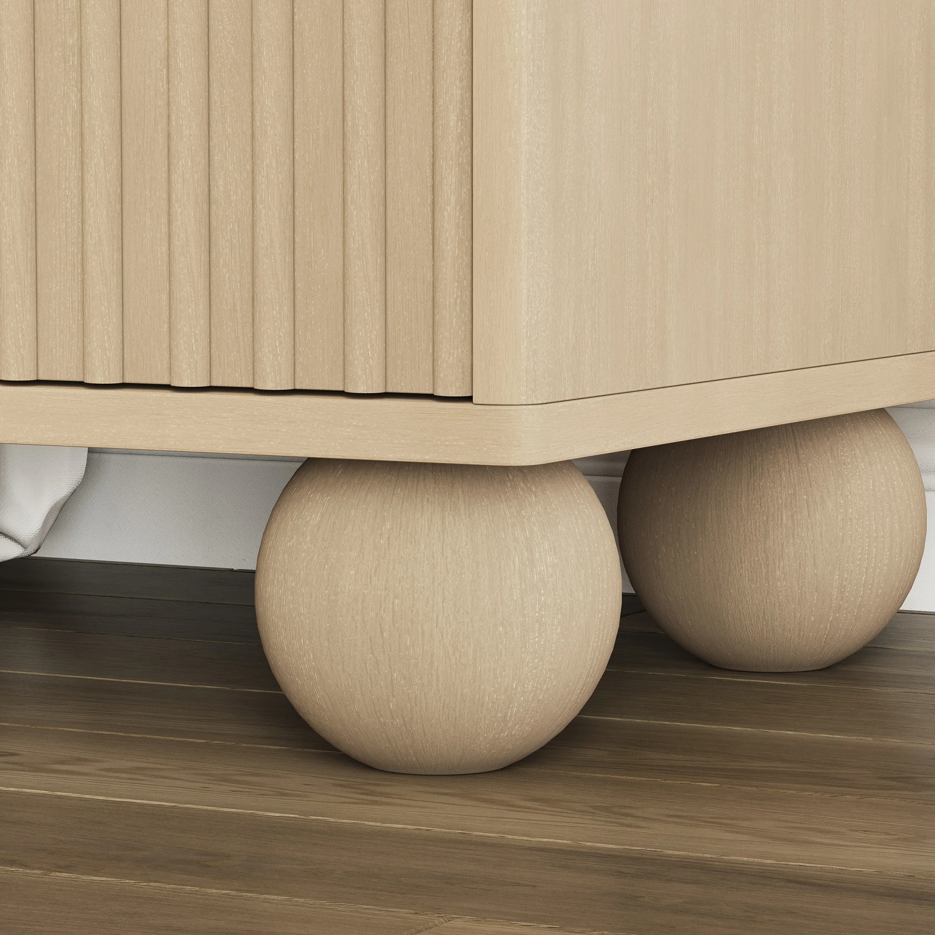 Bring sculptural elegance into your bedroom with this bedroom set, crafted from solid rubberwood for strength and durability. The fluted headboard introduces architectural texture and refined detail, while the bold spherical legs add a playful yet grounded silhouette. Its light natural finish softens the look, blending seamlessly with modern or transitional interiors. The nightstand comes with a built-in charging station on the top, keeping your devices powered up and your nightstand clutter-free. Two spacious drawers offer easy storage for bedside essentials, making it as practical as it is stylish.