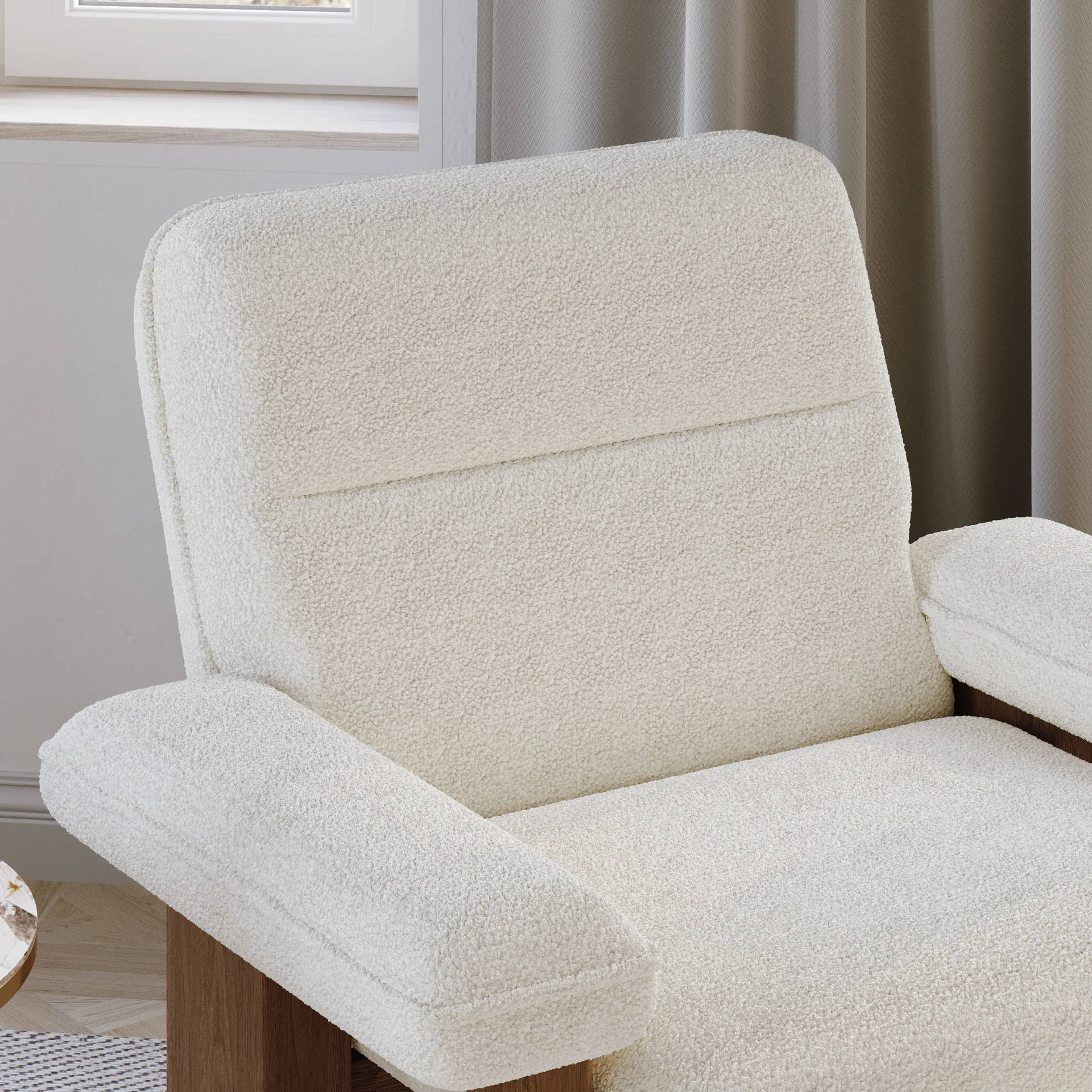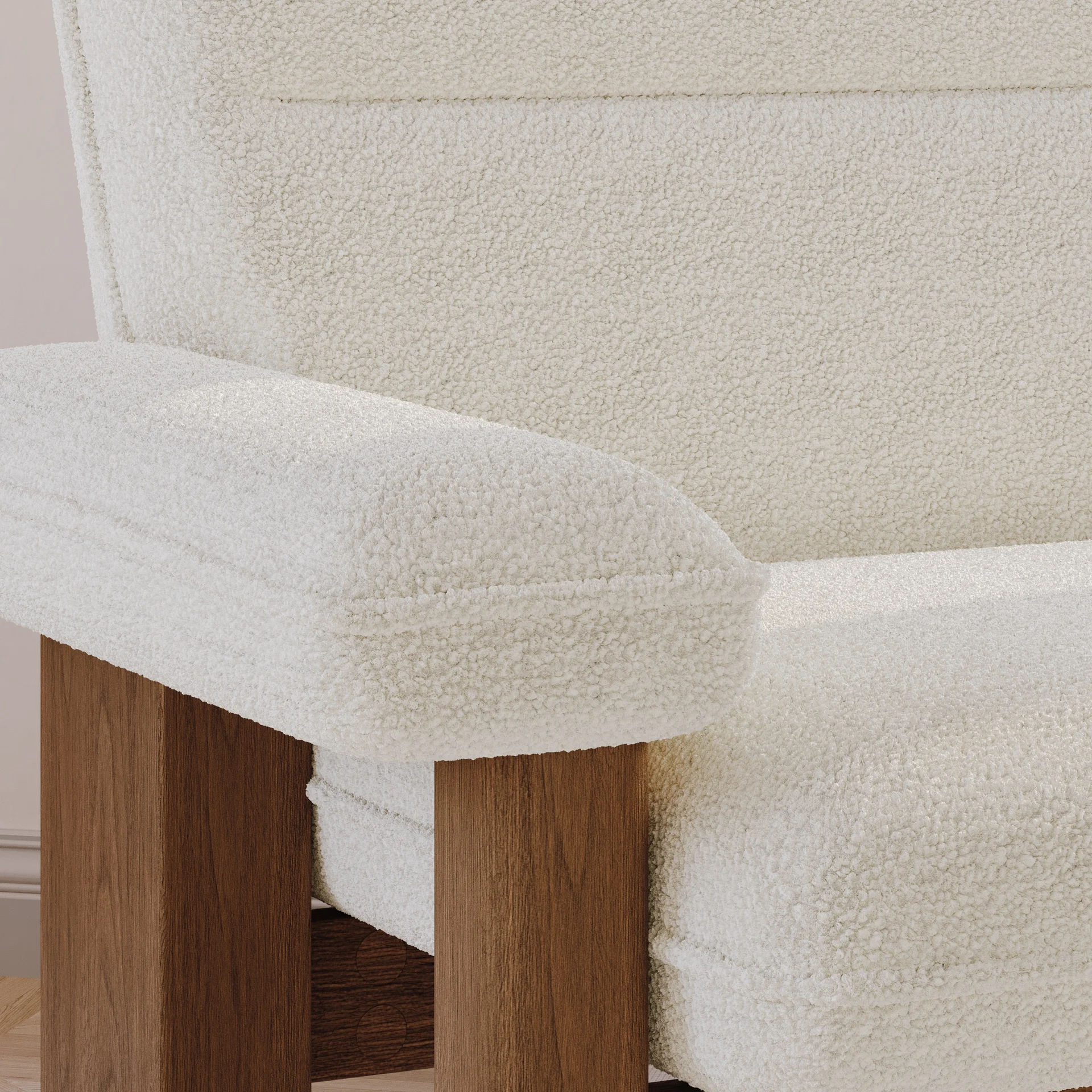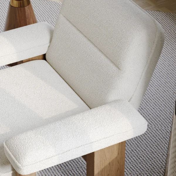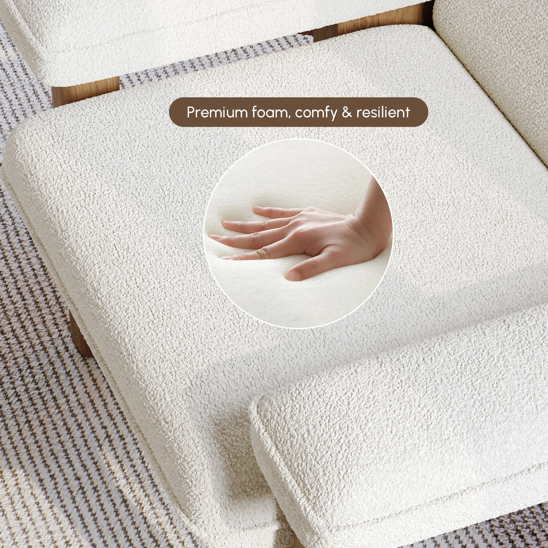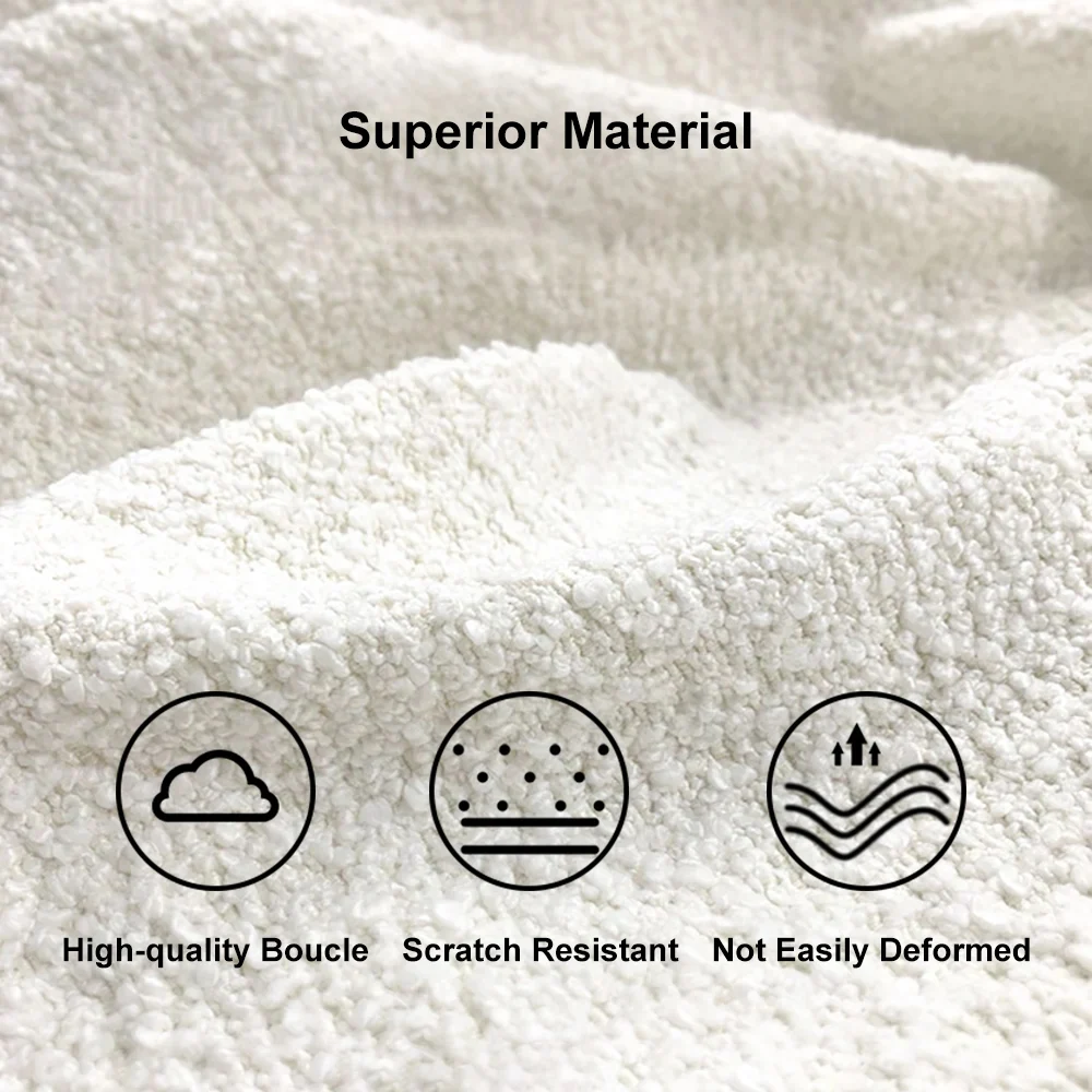 Luxuriously soft boucle upholstery with inviting texture for ultimate comfort and cozy elegance.