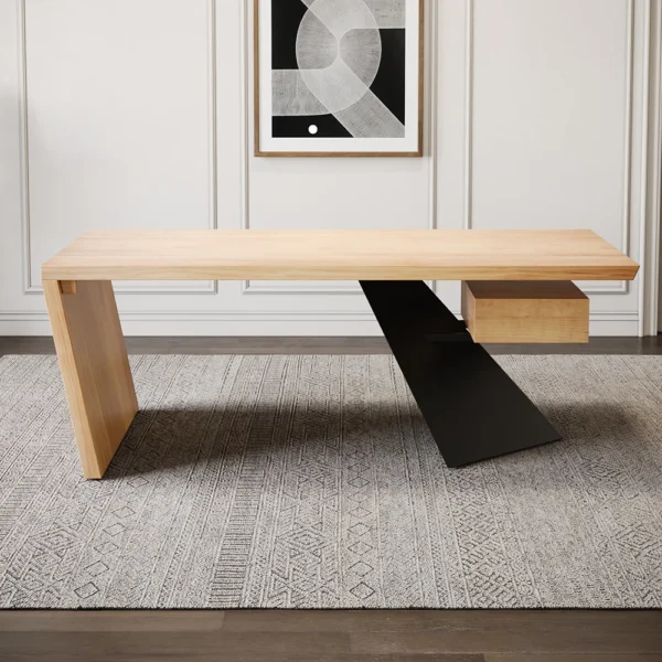 Crafted from sustainable solid rubber wood and wrought metal, this modern desk combines minimalist design with functionality. Its spacious tabletop and floating drawer offer ample workspace and storage, while the angled legs ensure stability. Perfect for home offices, it blends rustic charm with contemporary elegance.