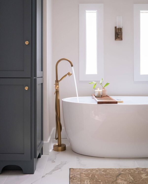 This beautiful freestanding tub faucet will fit seamlessly into any modern or classic bathroom. It features a streamlined styling with the straight lever handle, a clean, simple look. To fill the tub rapidly and easily, this design comes with a high-arc spout that can be rotated from left to right 360 degrees. The matching hand shower can provide more convenience for rinsing off after bath. Crafted for looks and built for reliability, this freestanding tub faucet is ideal for your bathroom!