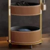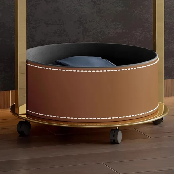 This modern saddle leather coat rack stand features a sleek design with two trays and stainless steel frame with 6 hooks, perfect for adding style and function to your entryway. It keeps your coats, bags, and accessories organized while offering a touch of elegance.