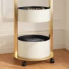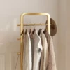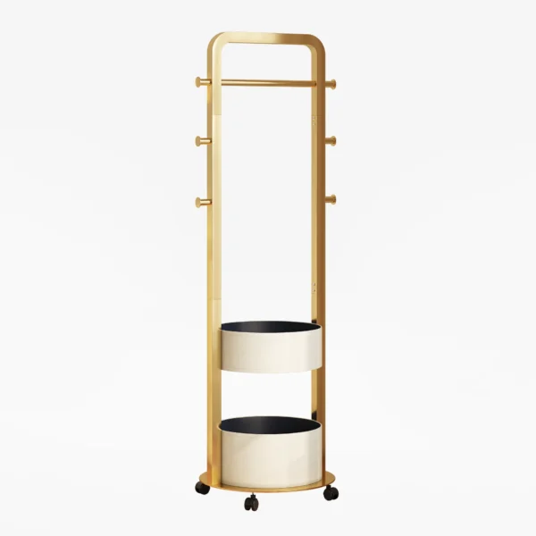 This modern saddle leather coat rack stand features a sleek design with two trays and stainless steel frame with 6 hooks, perfect for adding style and function to your entryway. It keeps your coats, bags, and accessories organized while offering a touch of elegance.