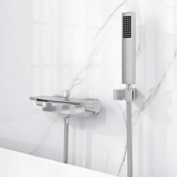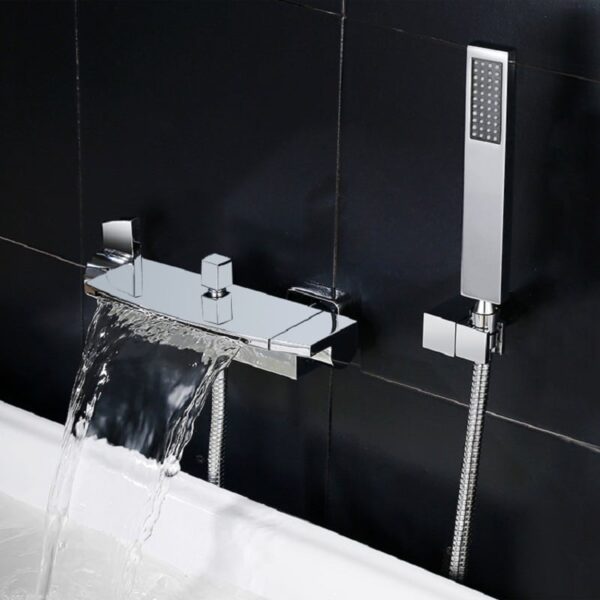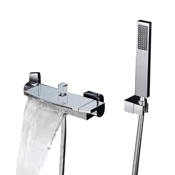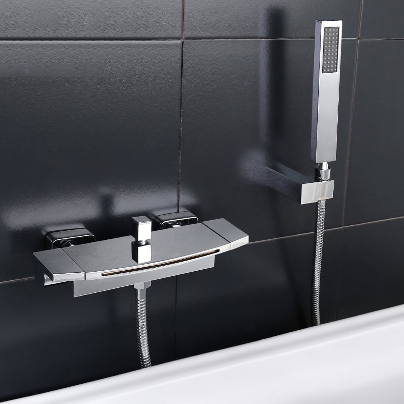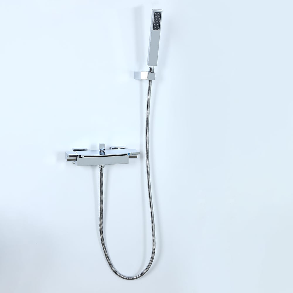 Destined to become the statement piece in your bathroom, this wall mount tub filler faucet has an appealing modern design and solid brass construction. Featuring a horizontal flat spout, it sends a sheet of water down in the bathtub, creating a handsome waterfall effect. Pull and turn the square diverter knob, and water can be diverted from the spout to the hand shower. And the hand shower offers extra motion to aim at the specific area of your body. The polished chrome finish is available to suit your existing decor scheme.