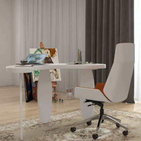 Stylize your room with an elegant writing desk. It has a curved design that gives it a distinctive appeal. This desk has a simple style that will accentuate your room. It is constructed from manufactured wood that makes this desk strong and long-lasting. This beautiful writing desk has a finish that will lend a stylish appeal to the room. With 3 oval-shaped legs, this contemporary desk add extra detail with its angled edges.