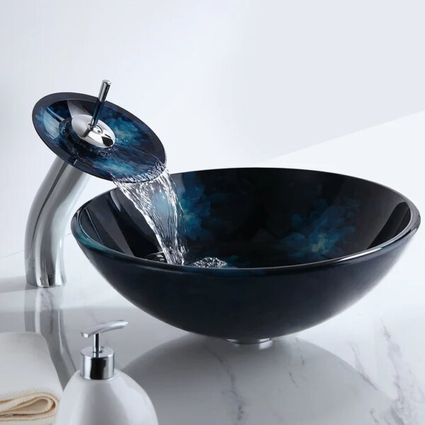 This dark blue combo set will be the statement in any residential or hospitality setting. Artistically painted in two-tone blue, this design is eye-catching and unique to add depth and dimension to bathrooms or powder room. Handcrafted from tempered glass, the sink has a strong and lustrous surface that prevents discoloration and fading and requires less maintenance. The faucet features a glass spout in a matching pattern that sends water down to create a waterfall. Enjoy this handsome vessel sink and faucet combo for years to come.