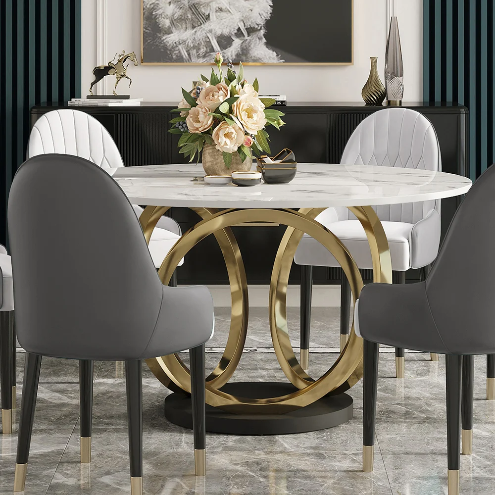 This 7-piece dining room set is an evolved version of classic minimalism. Overall dimensions create a focal point in a modern dining hall with a sophisticated overarching motif for six people in a contemporary setting. A dining hall white sintered stone table with a golden pedestal base gives the geometric forms a sharp and clean appearance. Six textured chairs create a more inviting and comfortable space. The dining table set is fashionable and long-lasting, so it will go well with whatever modern decoration scheme you have in mind.