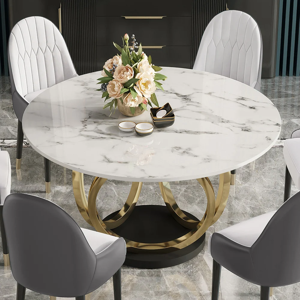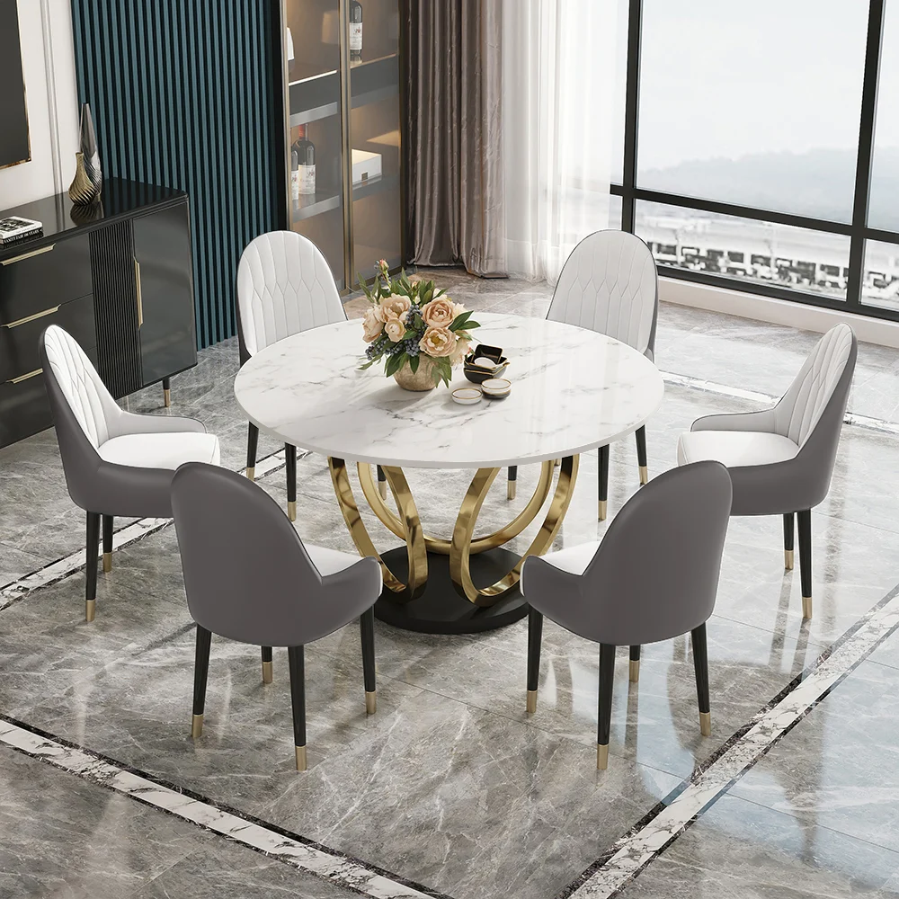 Dining Set 53″ Sintered Stone Round Dining Table White & Gray with 6 Chairs