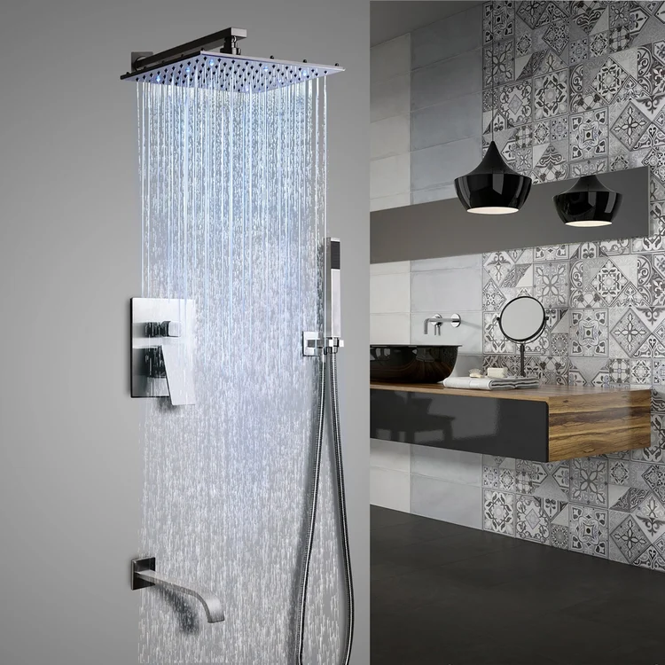 – Includes 10″ (250mm) rain shower head, wall mount shower arm, hand shower parts, a tub spout and 3-function shower valve.