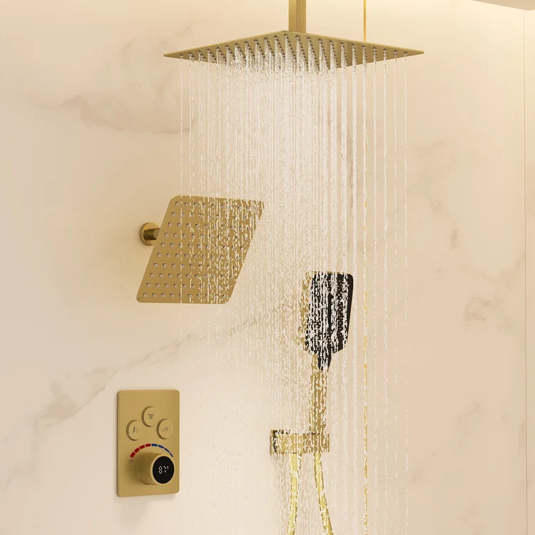 The integrated button-and-knob control panel allows seamless switching between outlets, while the pressure-balancing valve ensures a steady flow and safe water temperature. With a real-time Fahrenheit digital temperature display, every shower is precise and comfortable. Designed with modern elegance in brushed gold, this shower system transforms your bathroom into a luxurious retreat.