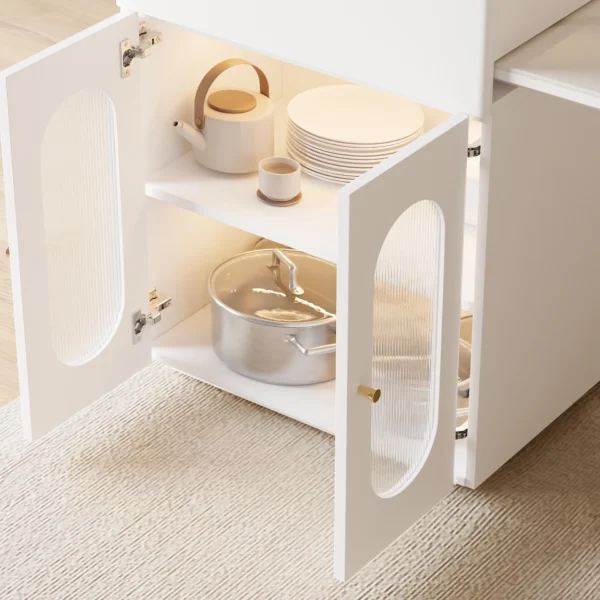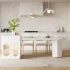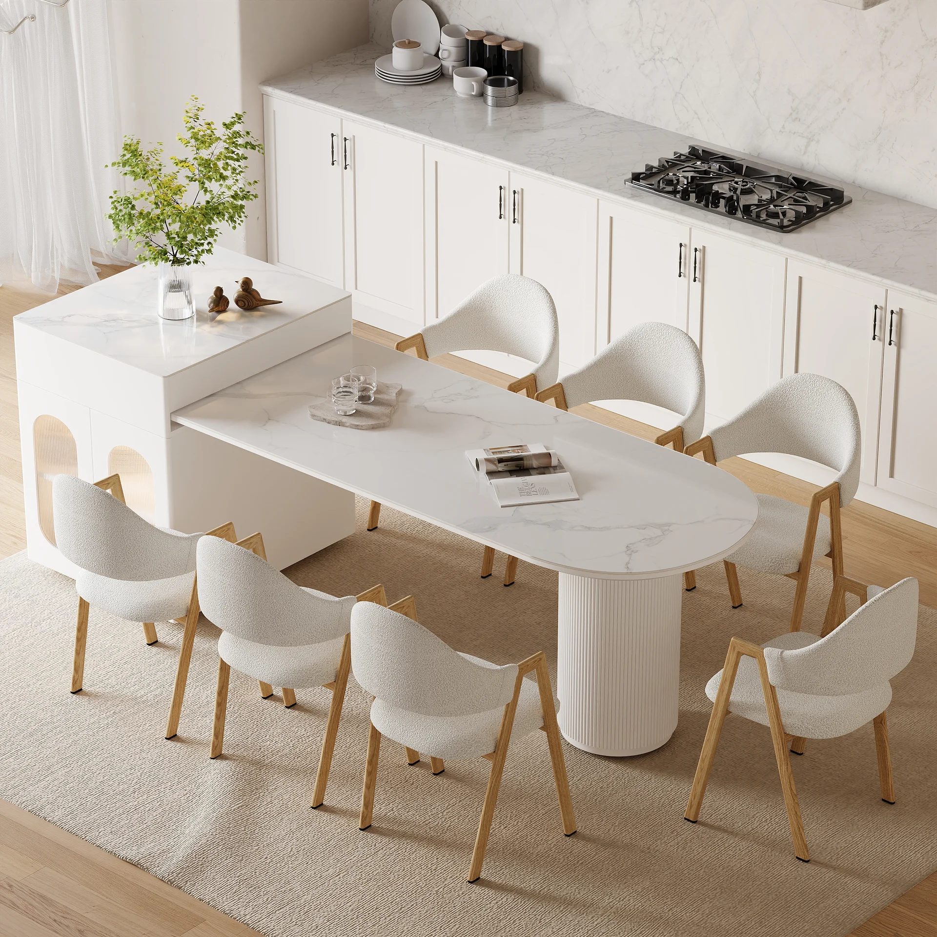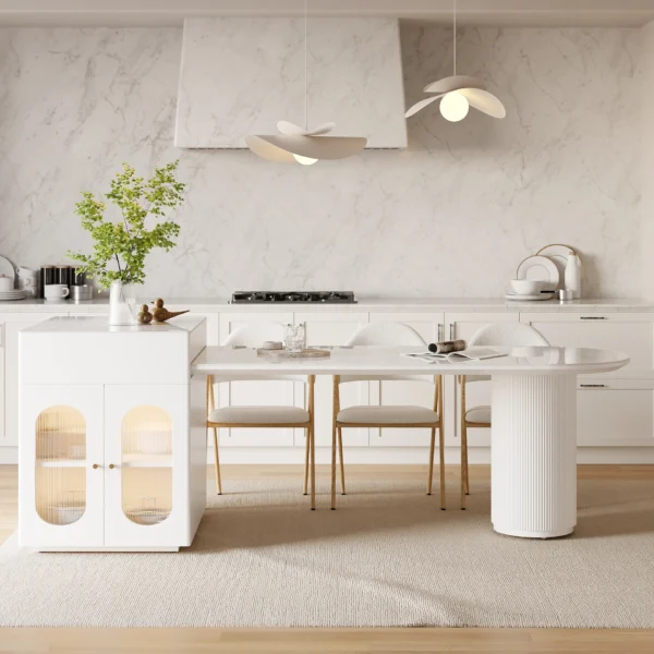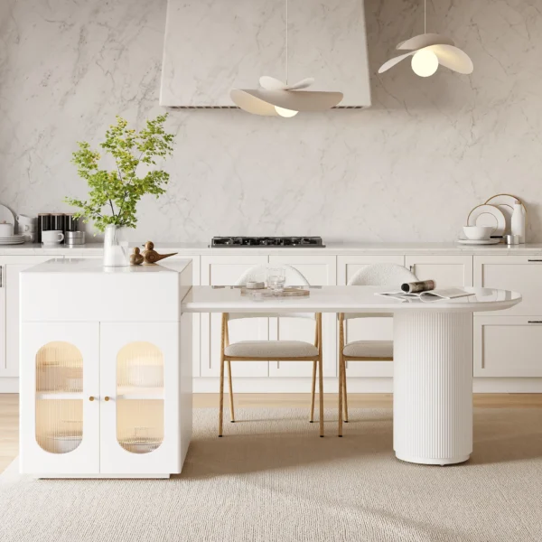 Upgrade your kitchen with this expandable island. Marble-pattern top, LED-lit cabinets, and versatile seating make it perfect for family meals, casual coffee breaks, and festive gatherings.