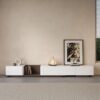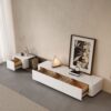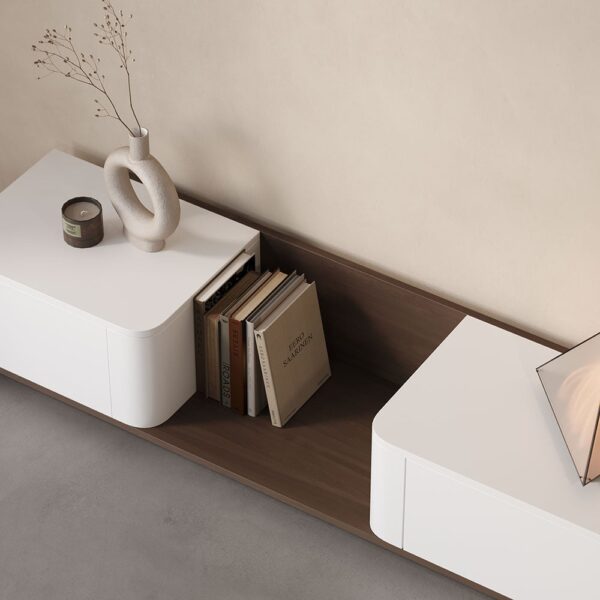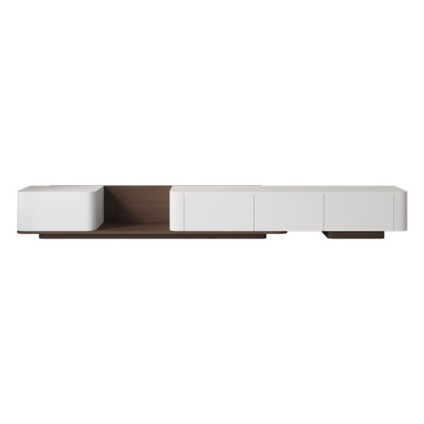 This extendable TV stand blends functionality with style, featuring a sleek retracted and expandable design. The walnut and off white color combination creates a modern and calming atmosphere, while four drawers and multiple sections provide ample storage. Made from high-quality engineered wood with a matte lacquer finish, it is durable and easy to maintain.