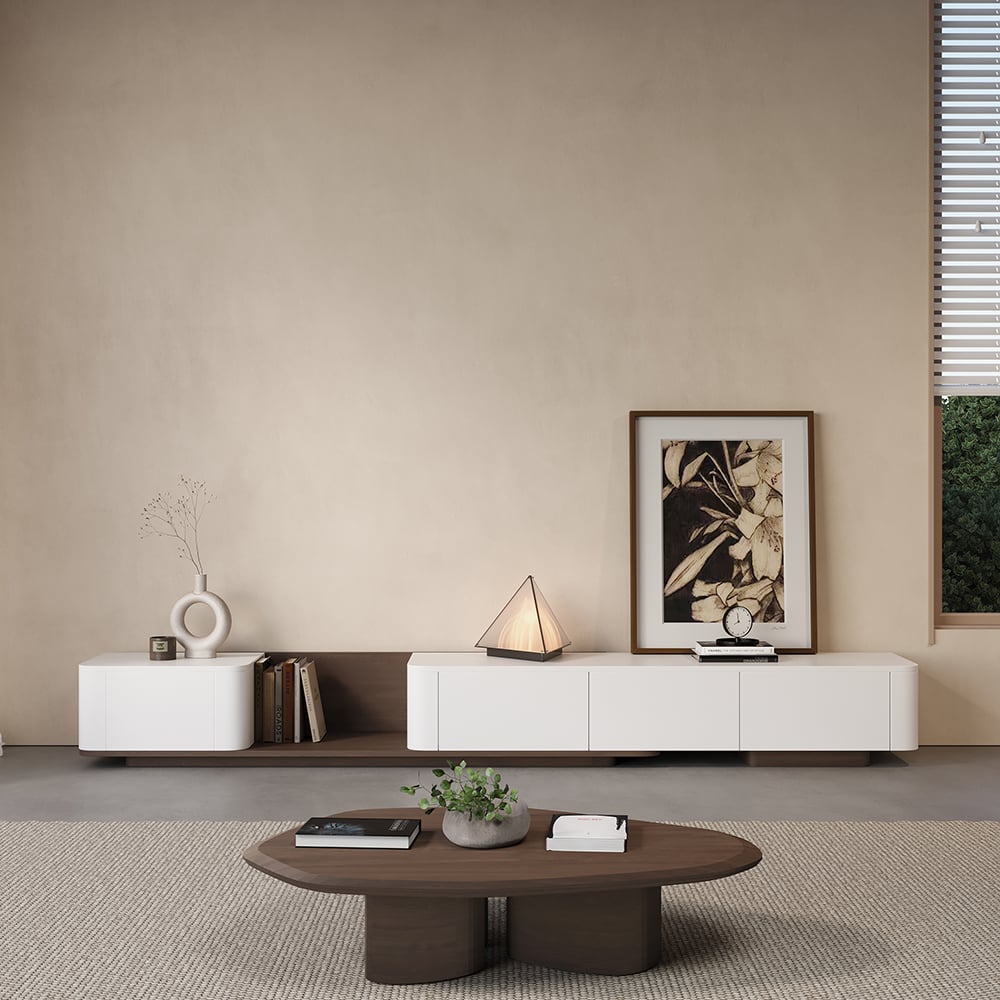 This extendable TV stand blends functionality with style, featuring a sleek retracted and expandable design. The walnut and off white color combination creates a modern and calming atmosphere, while four drawers and multiple sections provide ample storage. Made from high-quality engineered wood with a matte lacquer finish, it is durable and easy to maintain.