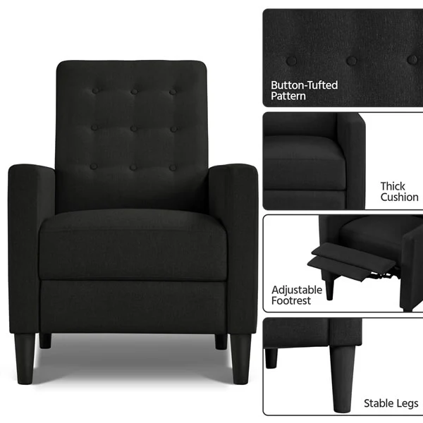 Fabric Recliner Sofa Mid-Century Modern Single Reclining Chair Adjustable Back & Footrest Tufted Upholstered Sofa Living Room Bedroom Home Theater Black
