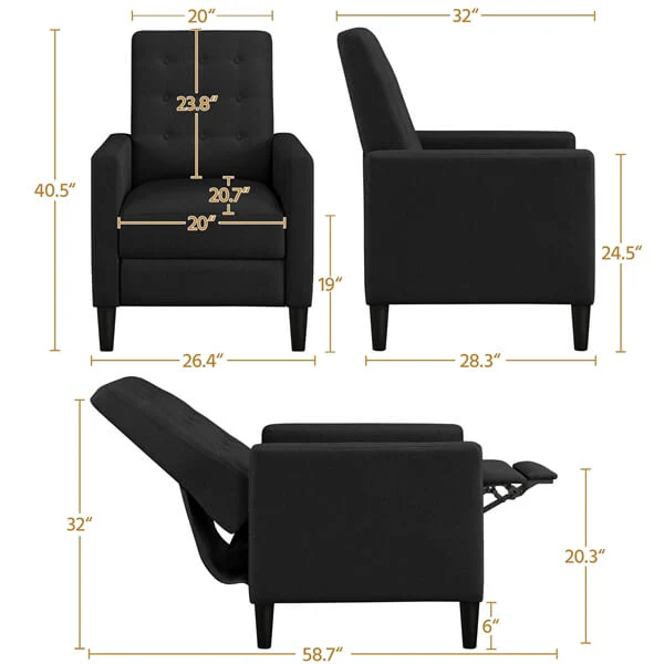 - 【5-minute Setup】This bedroom recliner chair requires 2 easy assembly steps – screw in the 4 legs, slot the back onto brackets, and done! No tool is needed and illustrated assembly instructions is included.