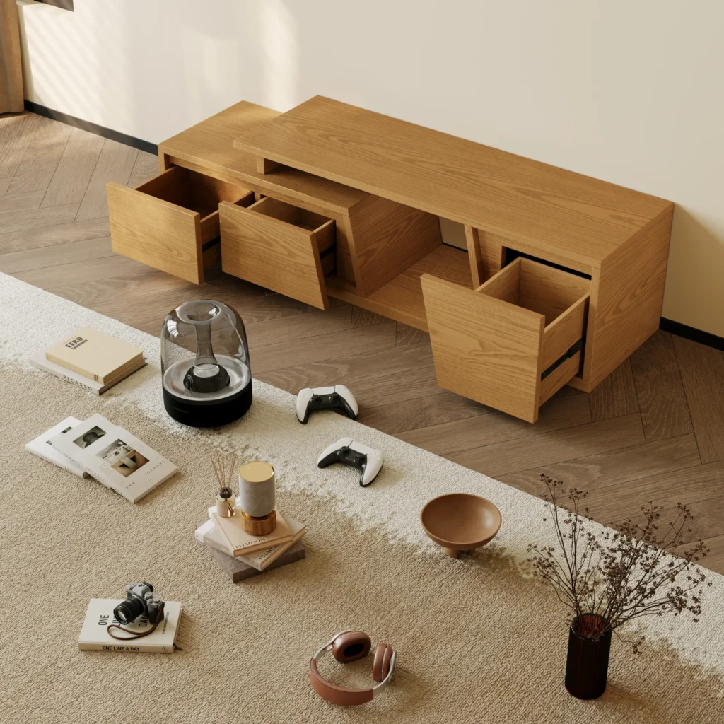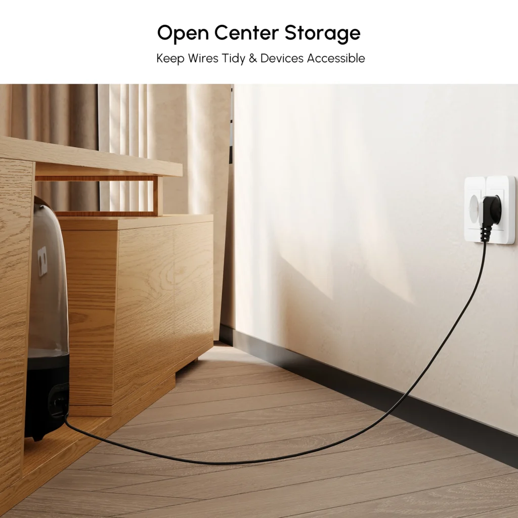 Open center storage keeps wires tidy & devices accessible.