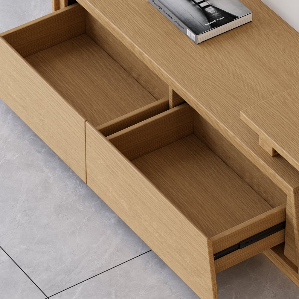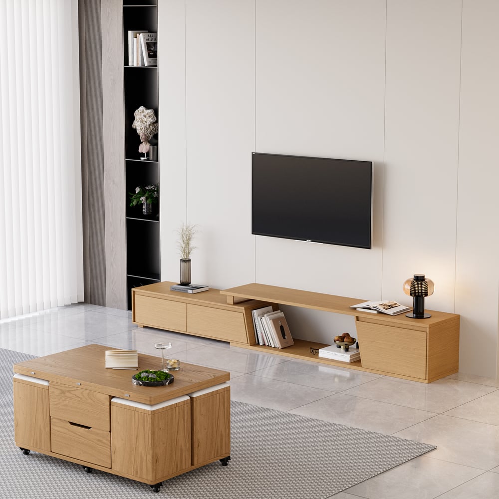 Fero TV stand features an extendable design and three spacious drawers, designed to complement TVs up to 110 inches in size. The extendable function provides great flexibility to fit various room layouts. This TV stand offers stylish decoration and practical storage options for contemporary living rooms. Note: The central storage area is not suitable for items weighing more than 22 lbs (10 kg).