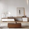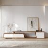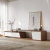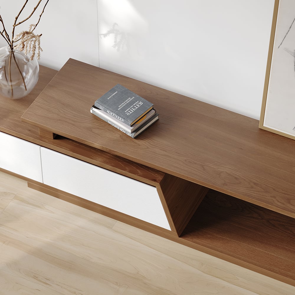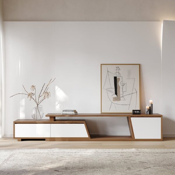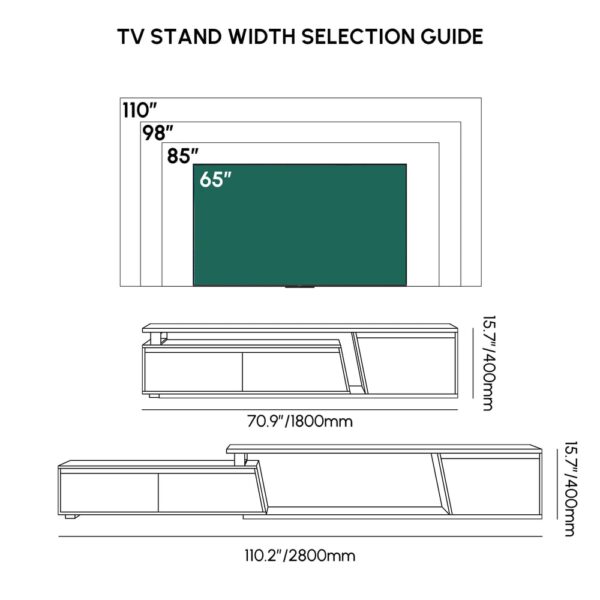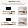 Fero TV stand features an extendable design and three spacious drawers, designed to complement TVs up to 110 inches in size. The extendable function provides great flexibility to fit various room layouts. This TV stand offers stylish decoration and practical storage options for contemporary living rooms. Note: The central storage area is not suitable for items weighing more than 22 lbs (10 kg).