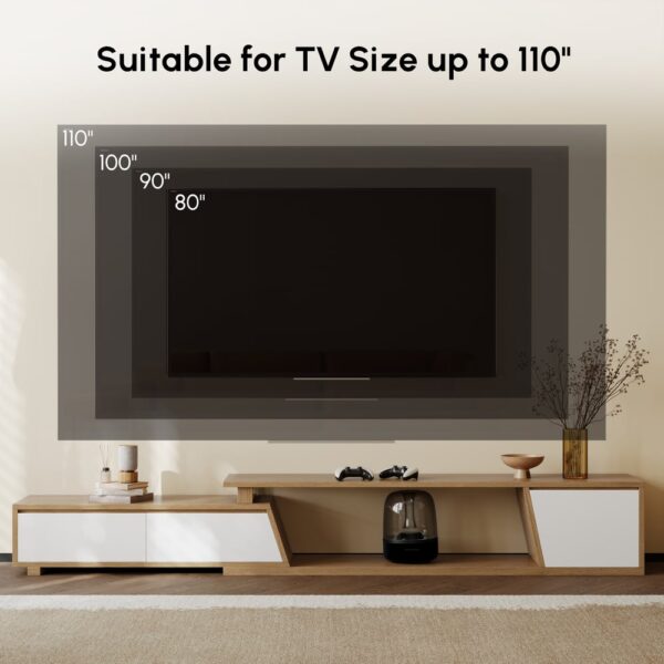 Fero TV stand features an extendable design and three spacious drawers, designed to complement TVs up to 110 inches in size. The extendable function provides great flexibility to fit various room layouts. This TV stand offers stylish decoration and practical storage options for contemporary living rooms. Note: The central storage area is not suitable for items weighing more than 22 lbs (10 kg).