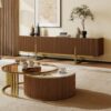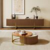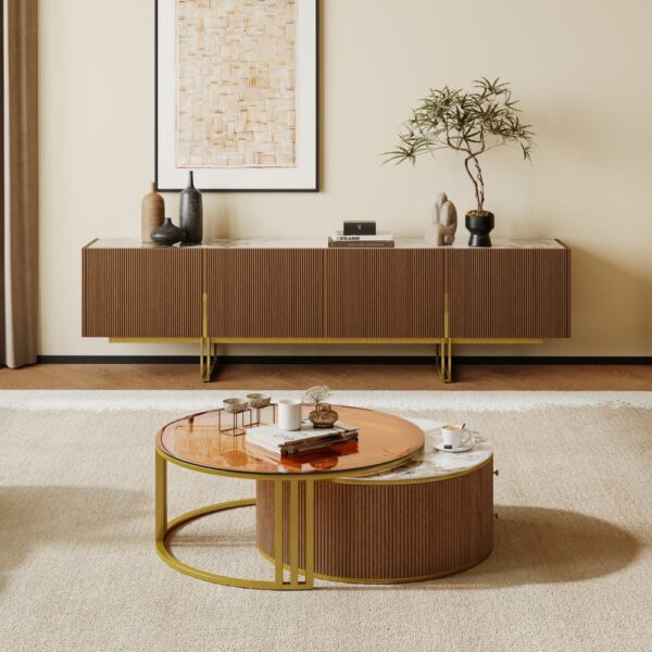 This modern TV stand features a premium stone top for both aesthetics and functionality. It would fit perfectly into any modern room since its design features something in clean lines and understated elegance. The TV stand includes plenty of storage for all the media devices and accessories you have to keep your entertainment area free of clutter.