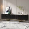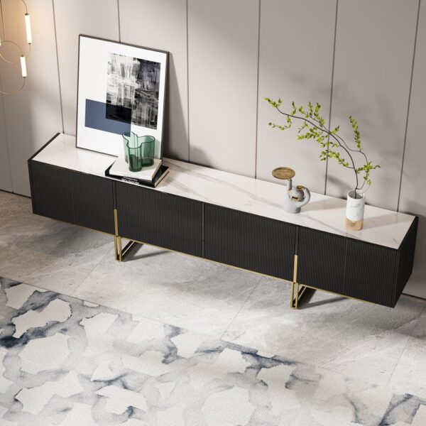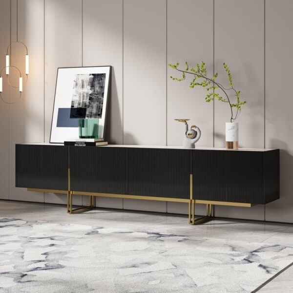 Grovyn TV Stand adds a modern touch to your living room with its sleek fluted design and gold stainless steel legs. The elegant sintered stone top offers both style and durability, while spacious cabinets and cable management bring a refined, clutter-free look to your space.
