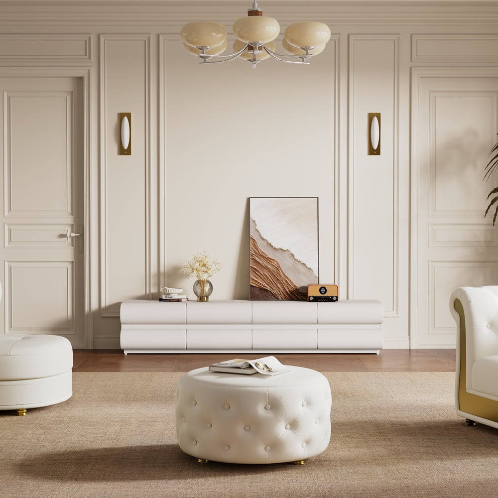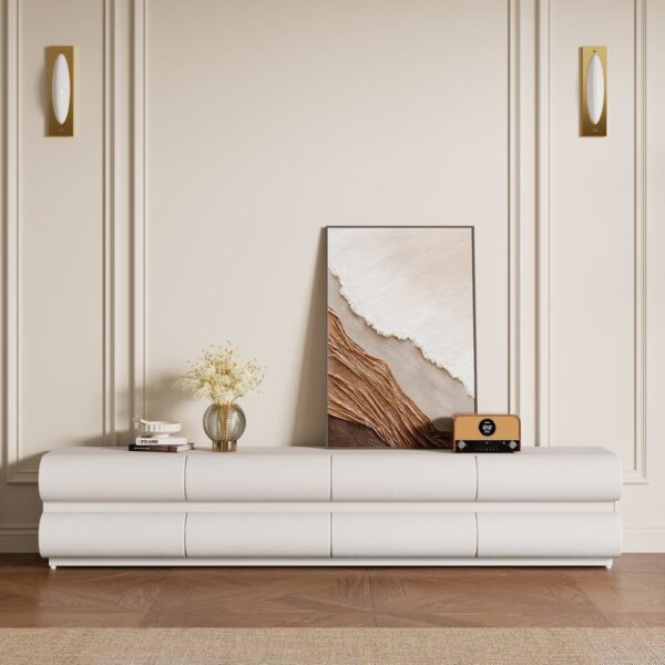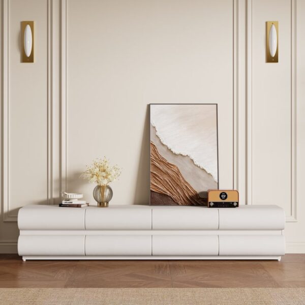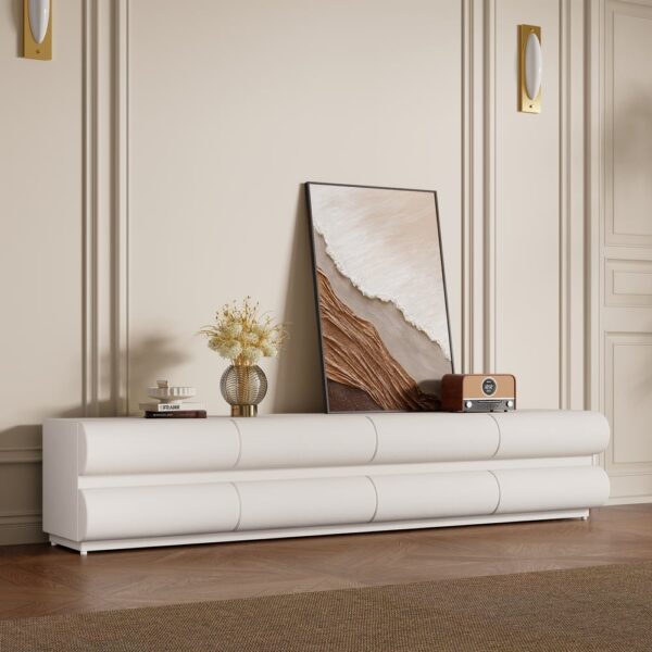 This streamlined media console features smooth faux leather upholstery in a soft white finish, accented by gently curved drawer fronts. With eight smooth-gliding drawers, it provides organized, concealed storage for media accessories, gaming gear, and living room essentials, keeping your space tidy and serene.